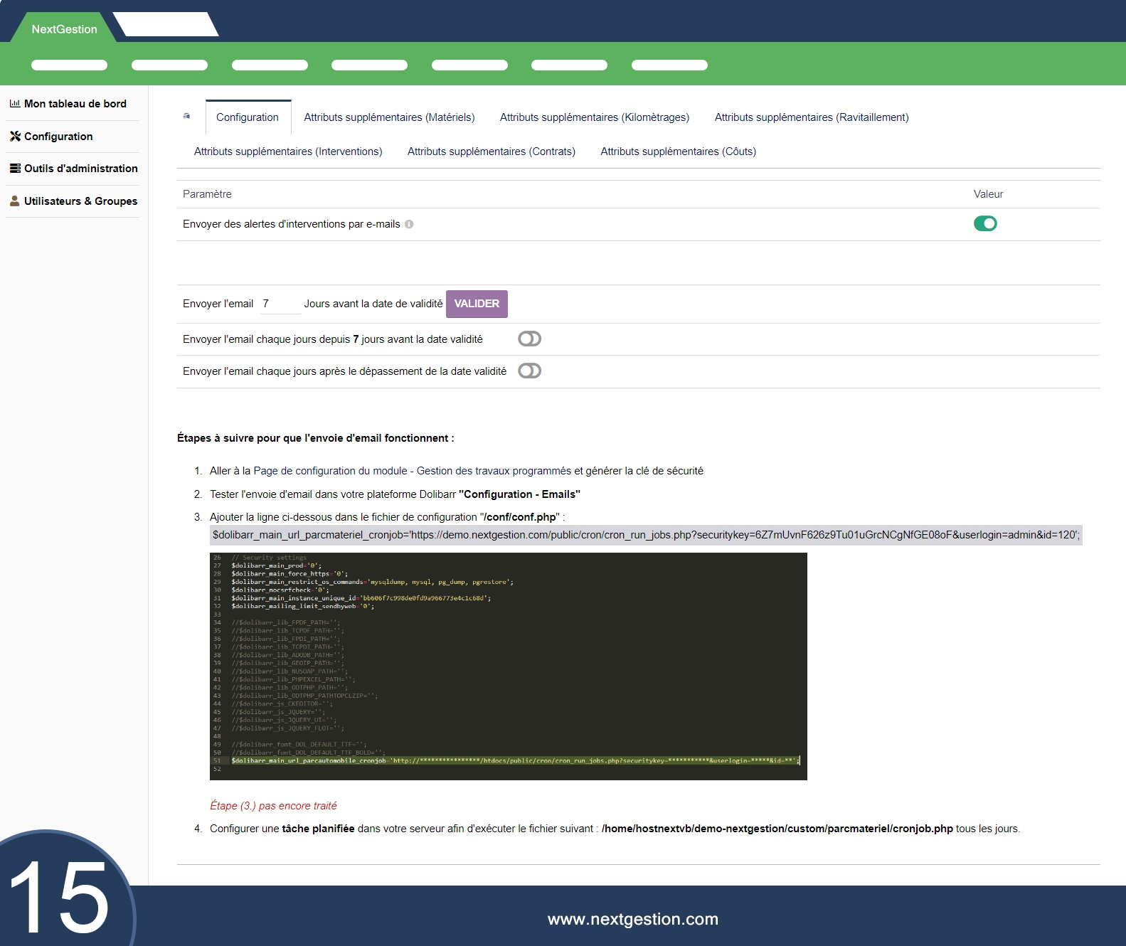 Der Verwaltungsbereich zentralisiert Verwaltungsdokumente und Informationen zu Ausrüstung und Material, wie Versicherungen, Fahrtenbücher, Fahrzeugscheine, Feuerlöscherkontrollen, Führerscheine, technische Inspektionen, Vignetten, Gewichts- und Metrologiesteuern.