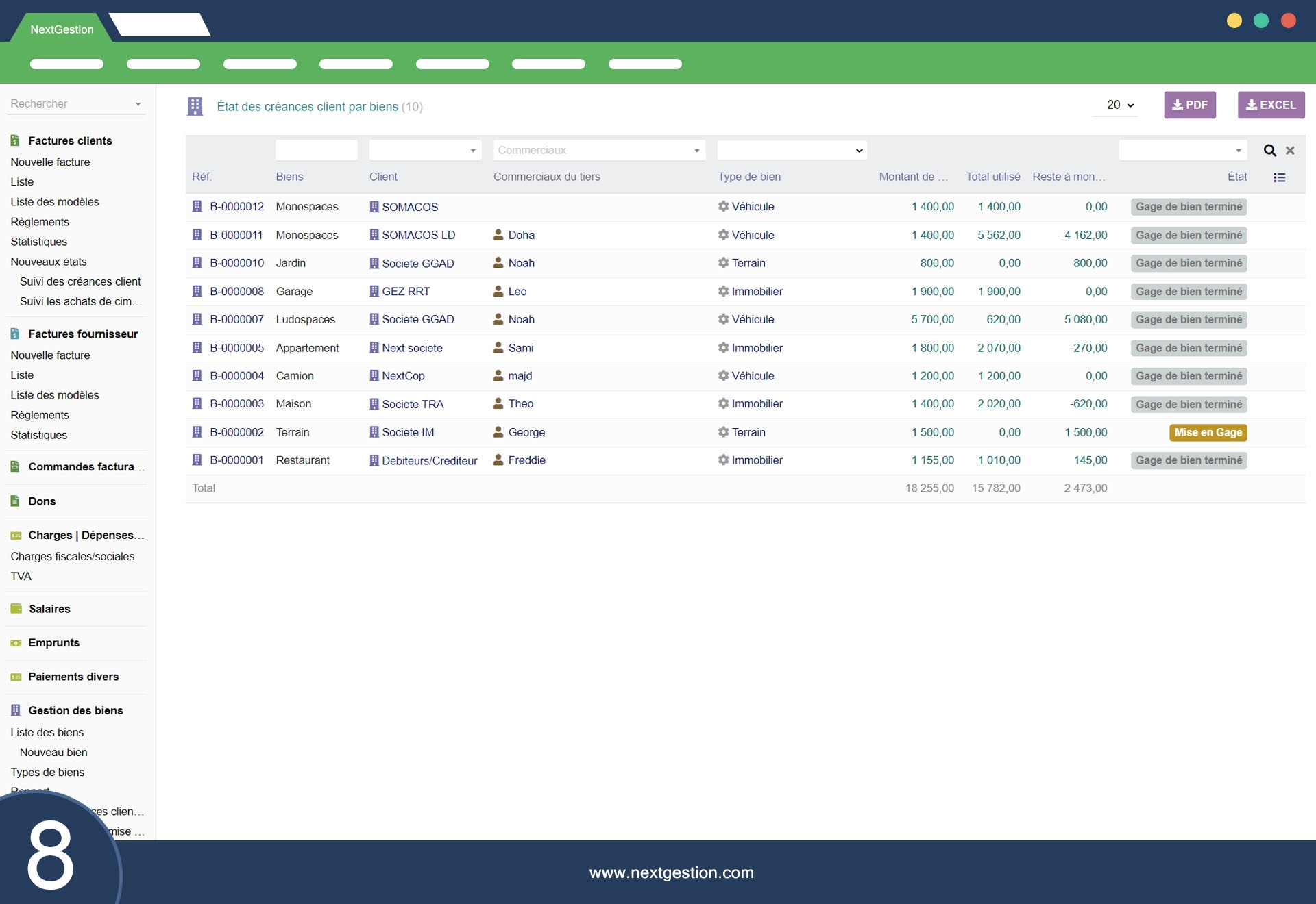2- Immobilienverwaltung: Mit diesem Modul können Sie Ihr gesamtes Vermögen effektiv verwalten. Sie können die Referenz des Vermögenswerts, seine Beschreibung, den Kunden, mit dem er verknüpft ist, die damit verbundenen Vertriebsmitarbeiter des Dritten, die Art des Vermögenswerts, die Verpfändung und das Enddatum der Verpfändung, den Betrag des Vermögenswerts usw. anzeigen Betrag, der noch fällig ist. und den aktuellen Zustand der Immobilie.