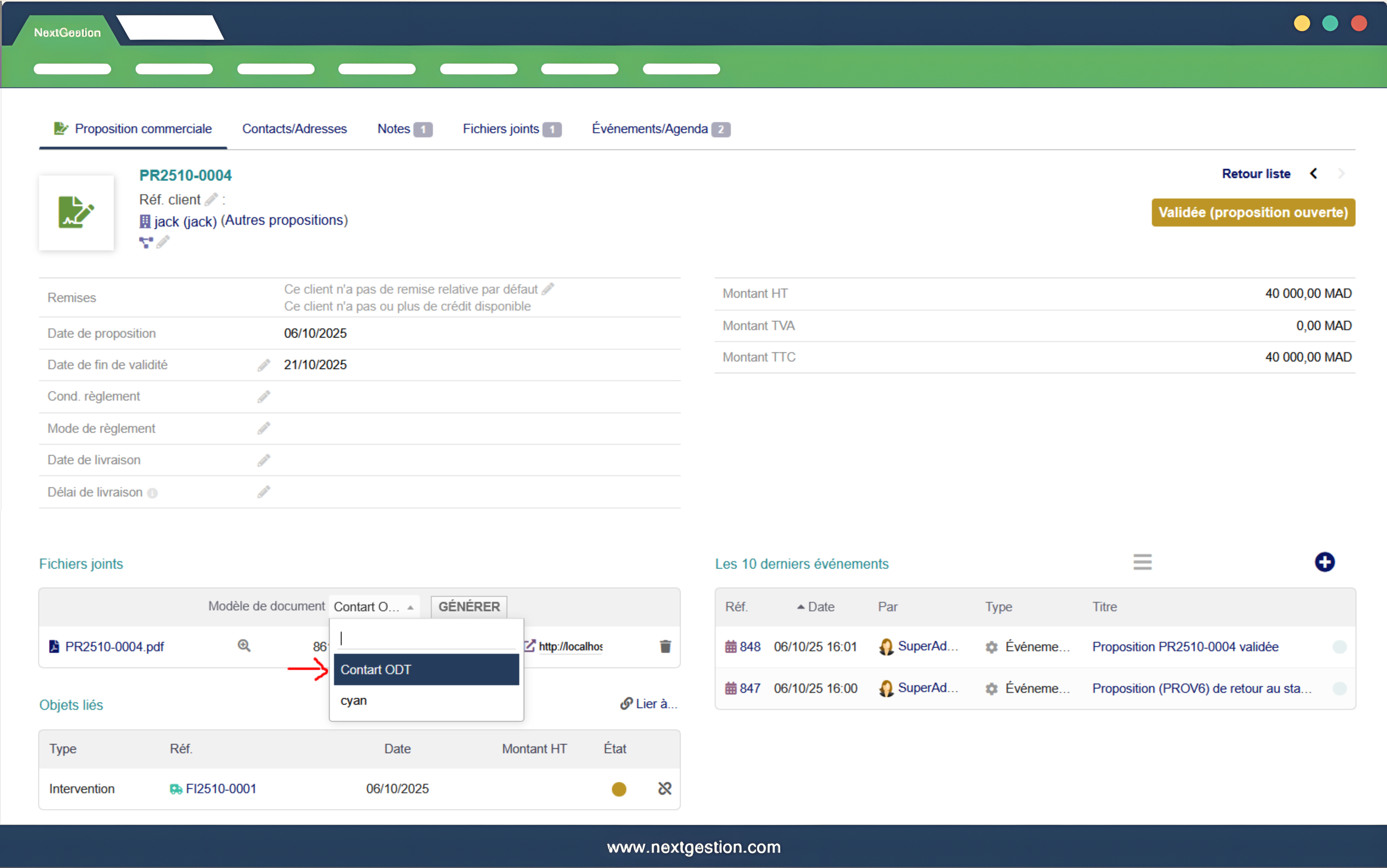 Das Modul liest automatisch alle Angebotsinformationen (Drittpartei, Kontakt, Daten, Referenzen, Positionen, Beträge usw.) ein, fügt sie in die ODT-Vorlage ein und legt die erzeugte Datei als Anhang am Angebot ab (z. B. Vertrag_ODT.odt). Das Dokument kann anschließend geöffnet, bei Bedarf angepasst, unterschrieben oder an den Kunden versendet werden.