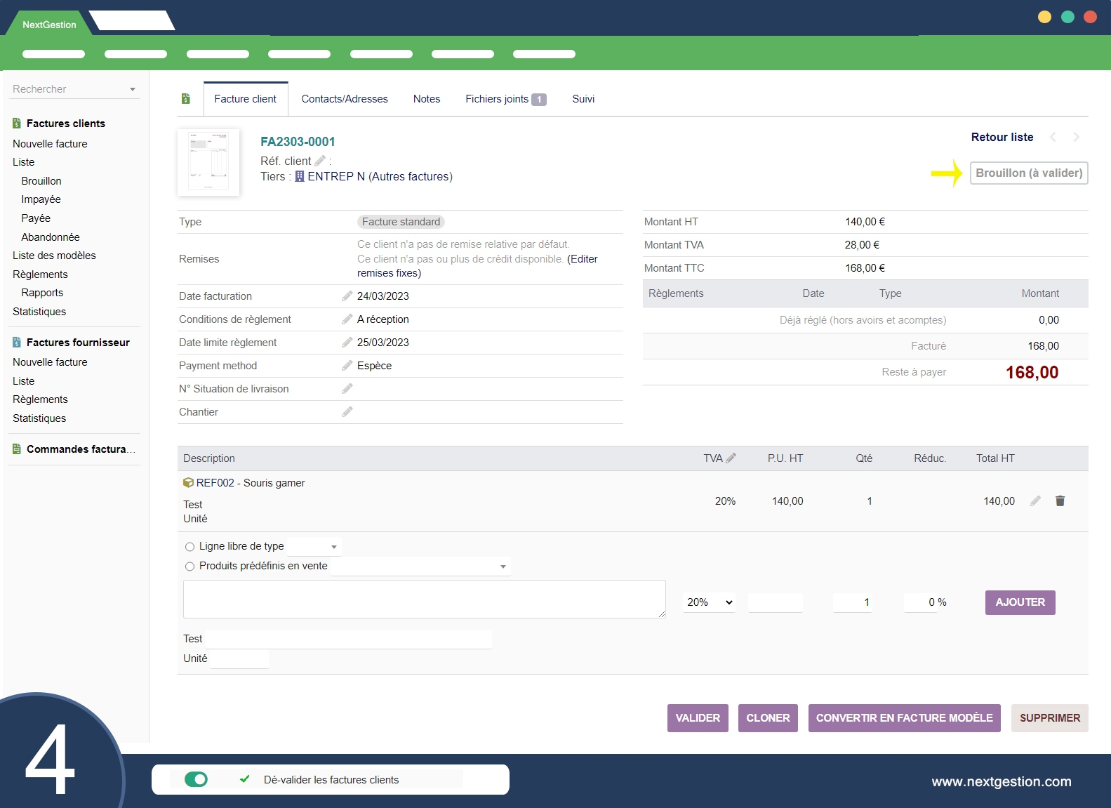 2- Invoice management: The module allows you to determine which users can validate or de-validate customer and supplier invoices. This is essential to ensure that invoices are approved by the appropriate people before being sent to customers or processed for suppliers.