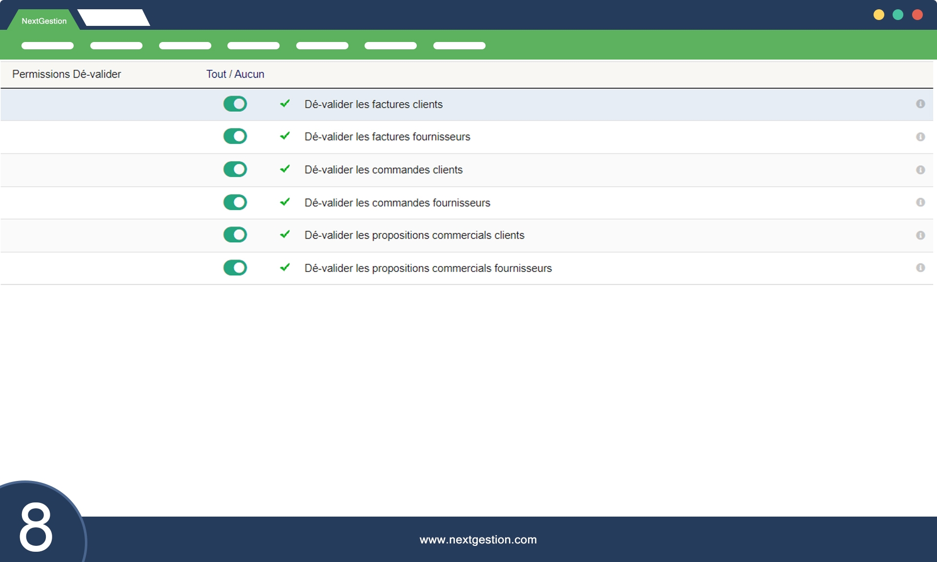 In summary, the "De-validate Permissions" module is a permission management tool that allows you to control user access rights for the validation and de-validation of invoices, orders and commercial proposals with customers and providers. This module ensures better organization and increased compliance with internal processes and applicable regulations.