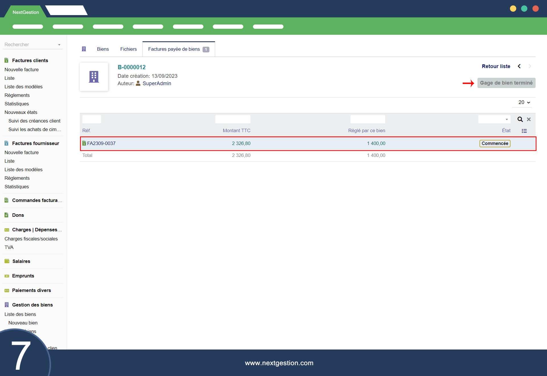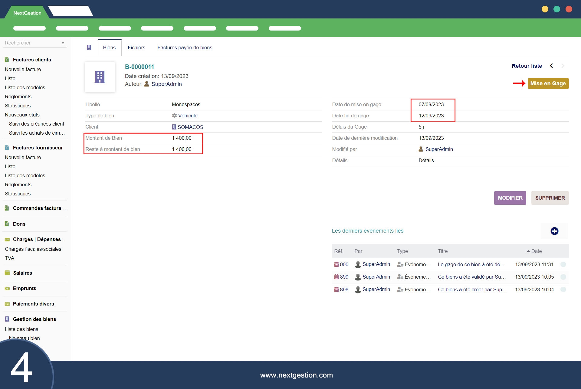 2- Property Management: This module allows you to effectively manage all your assets. You can display the reference of the asset, its description, the customer with whom it is associated, the third party's sales representatives linked to it, the type of asset, the pledge and end dates of the pledge, the amount of the asset, the amount remaining due. and the current condition of the property.