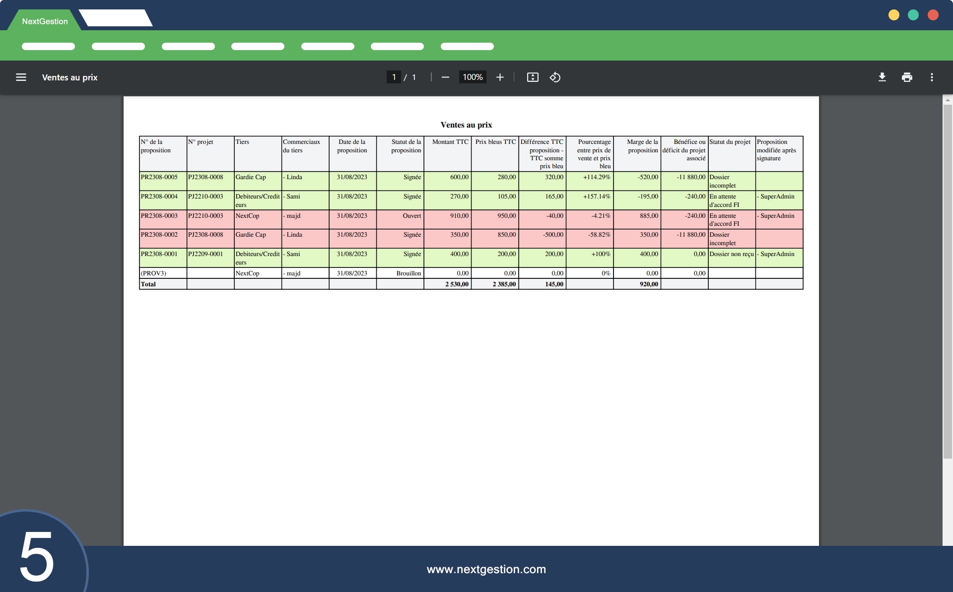 Proposal Analysis: Get a detailed view of each commercial proposal, including the total difference in VAT between the proposed price and the sum of the blue prices of the products included in the proposal. Lines are highlighted in red if the result is negative and in green if the result is positive.