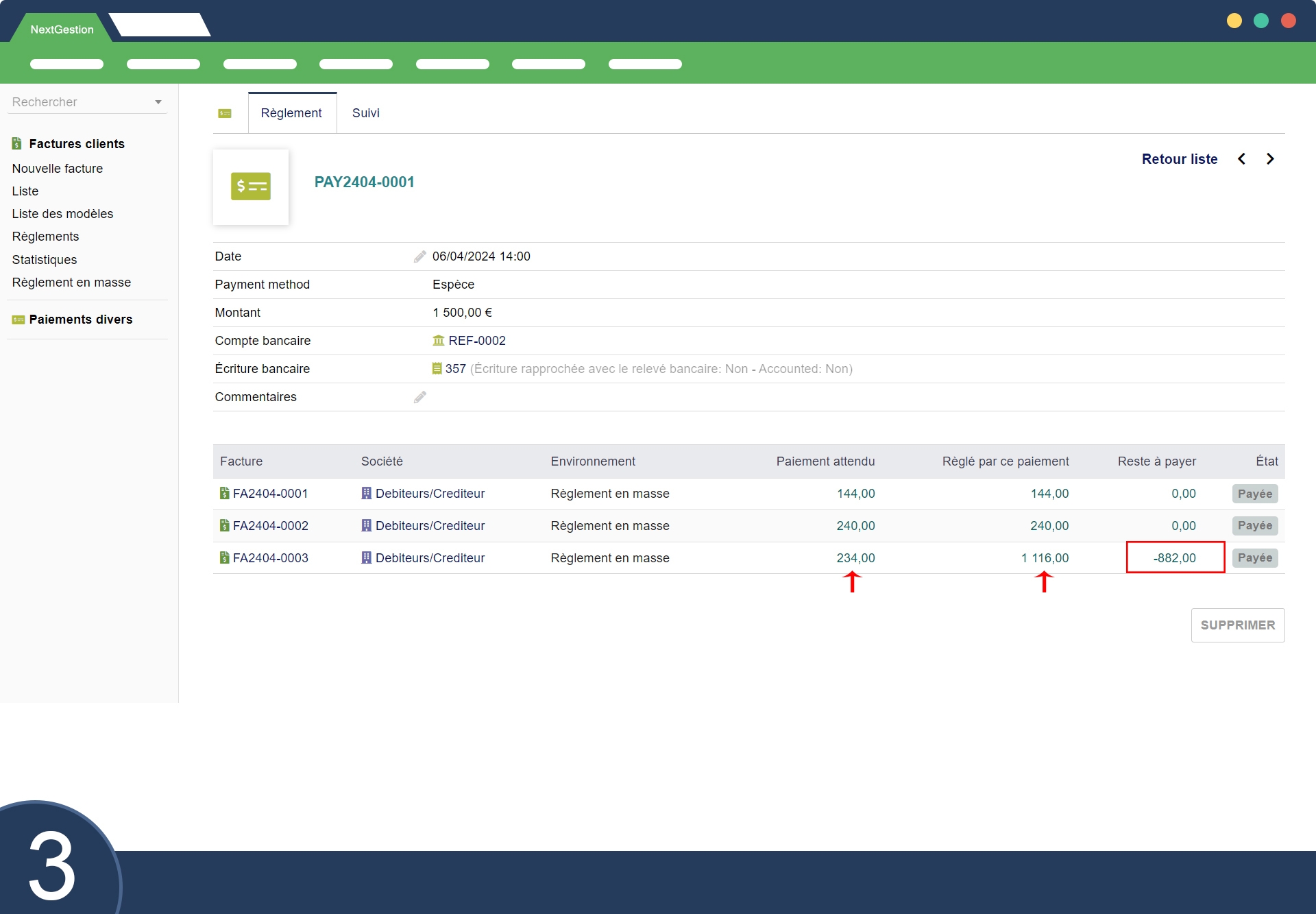 if we have 3 unpaid invoices (Invoice 1 = 10,000, Invoice 2 = 10,000 and Invoice 3 = 5,000) and our Total amount to be Imputed = 22,000 then the module will break down Payment Amount Invoice 1 = 10,000 Amount