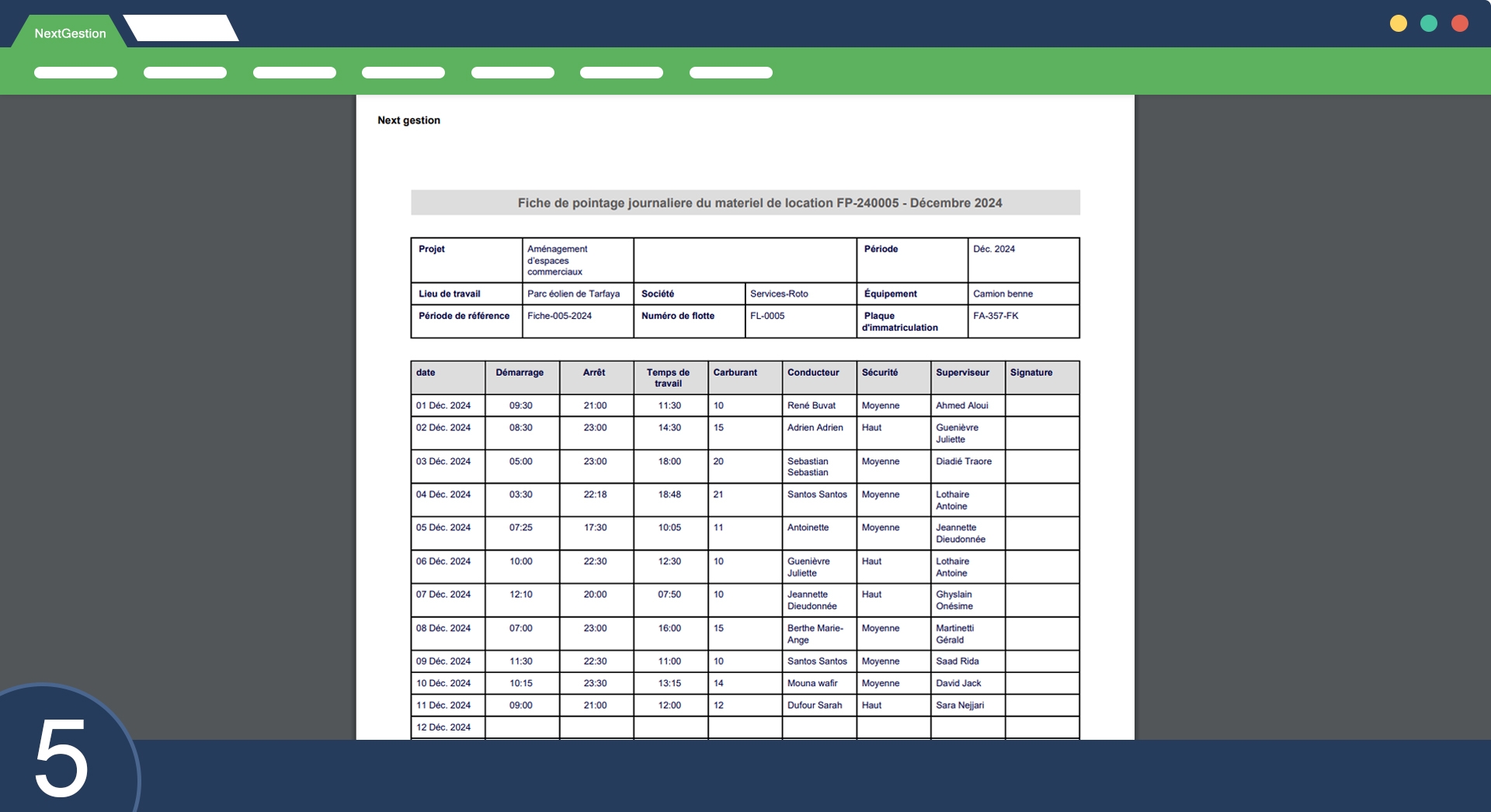 - Consult detailed lists displaying dates, work hours, drivers, and supervisors.