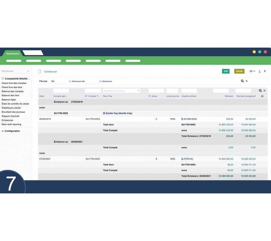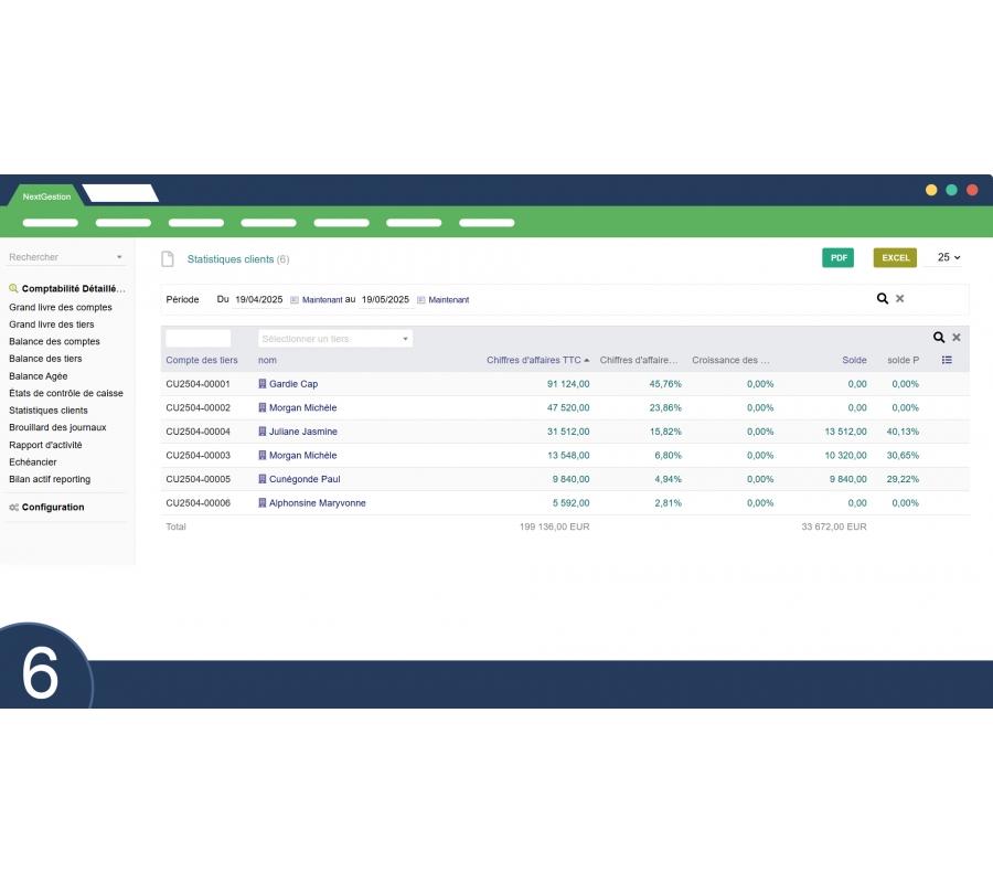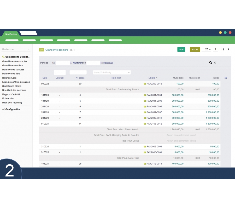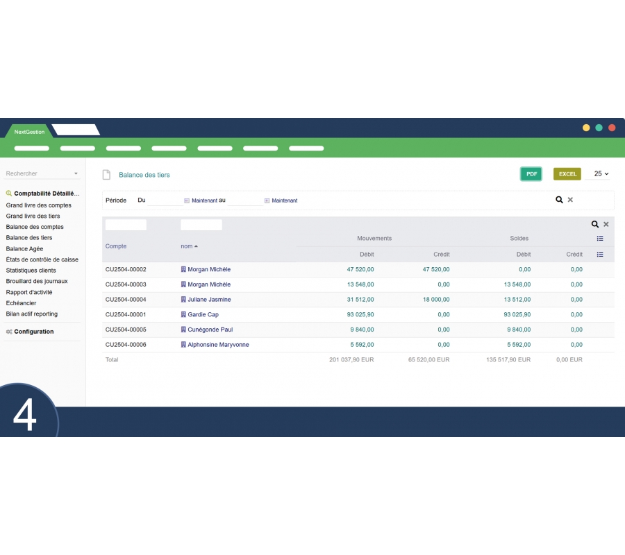 Offers a consolidated view of client and supplier balances through third-party accounts. Essential for managing receivables and payables.