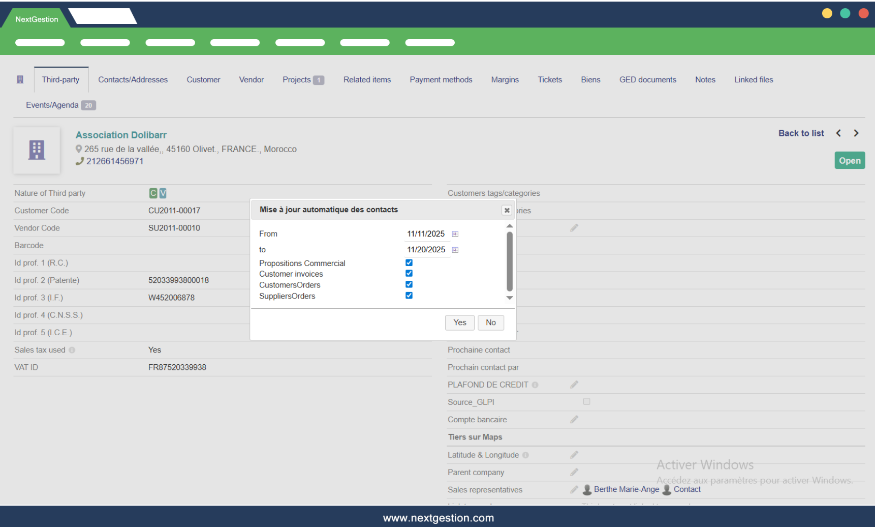 On a third party card, the module adds an “Automatic contact update” window: you select a date range (from … to …) and the document types to update, for example: