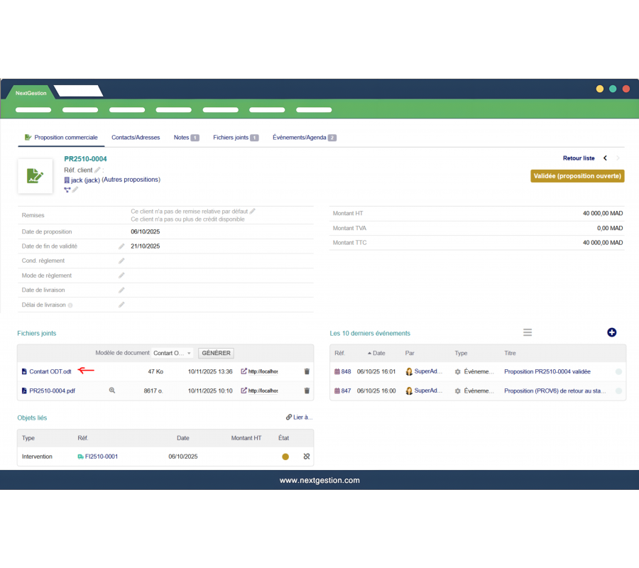 The module automatically retrieves the quote information (third party, contact, dates, references, lines, amounts, etc.), injects it into the ODT template and adds the generated file as an attachment to the proposal (e.g. Contrat_ODT.odt). The document can then be opened, adjusted if necessary, signed or sent to the customer.