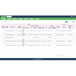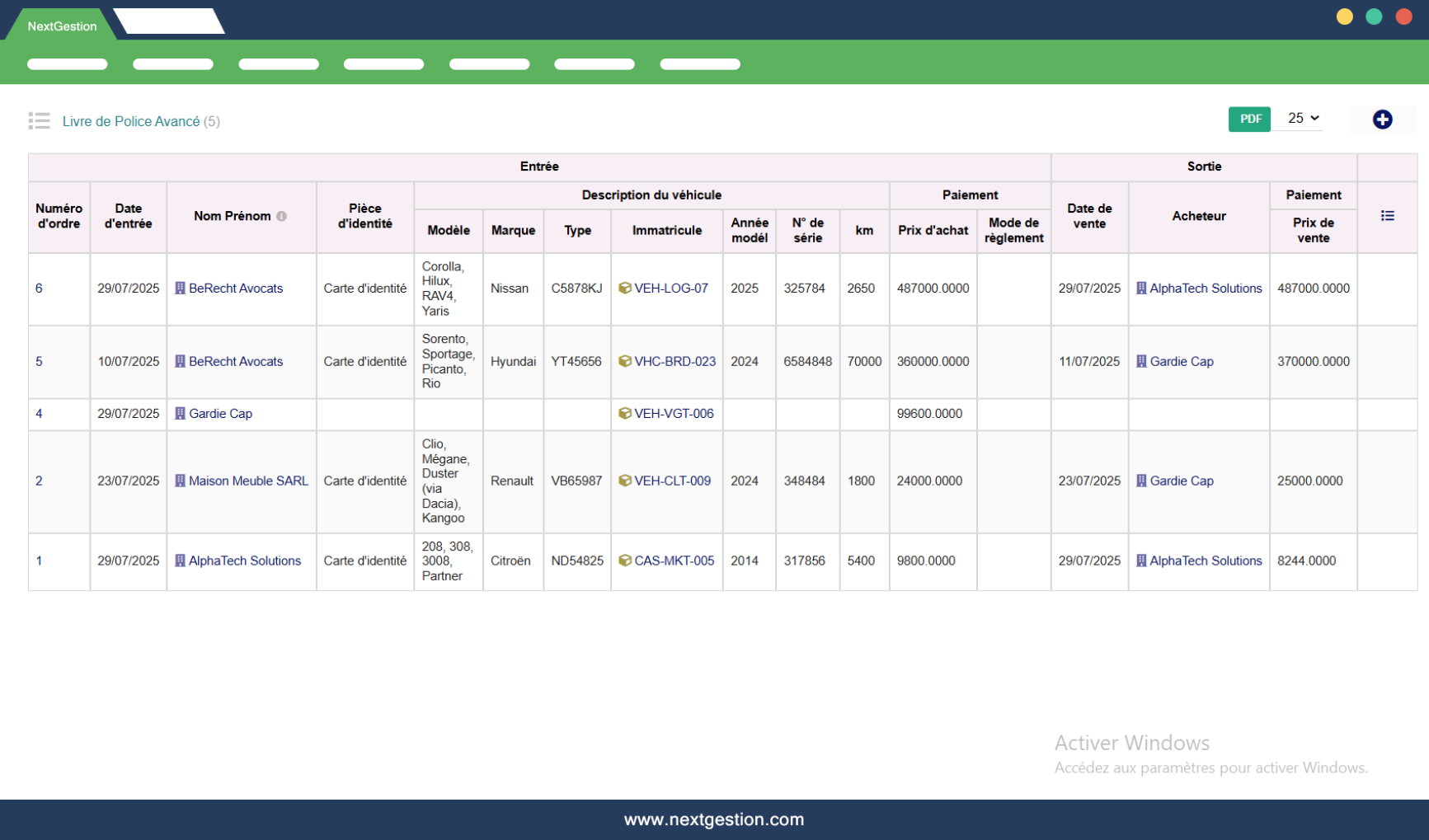 In a dedicated screen, the module displays for each vehicle a complete police book line with: order number, entry date, identity of supplier or customer, type of ID document, make, model, type, license plate, model year, serial number (VIN), mileage, purchase price, payment method, sale date, buyer, and sale price. Third parties (sellers/buyers) and vehicles remain linked to your Dolibarr records, so you can open the relevant customer, supplier or vehicle card with a single click.