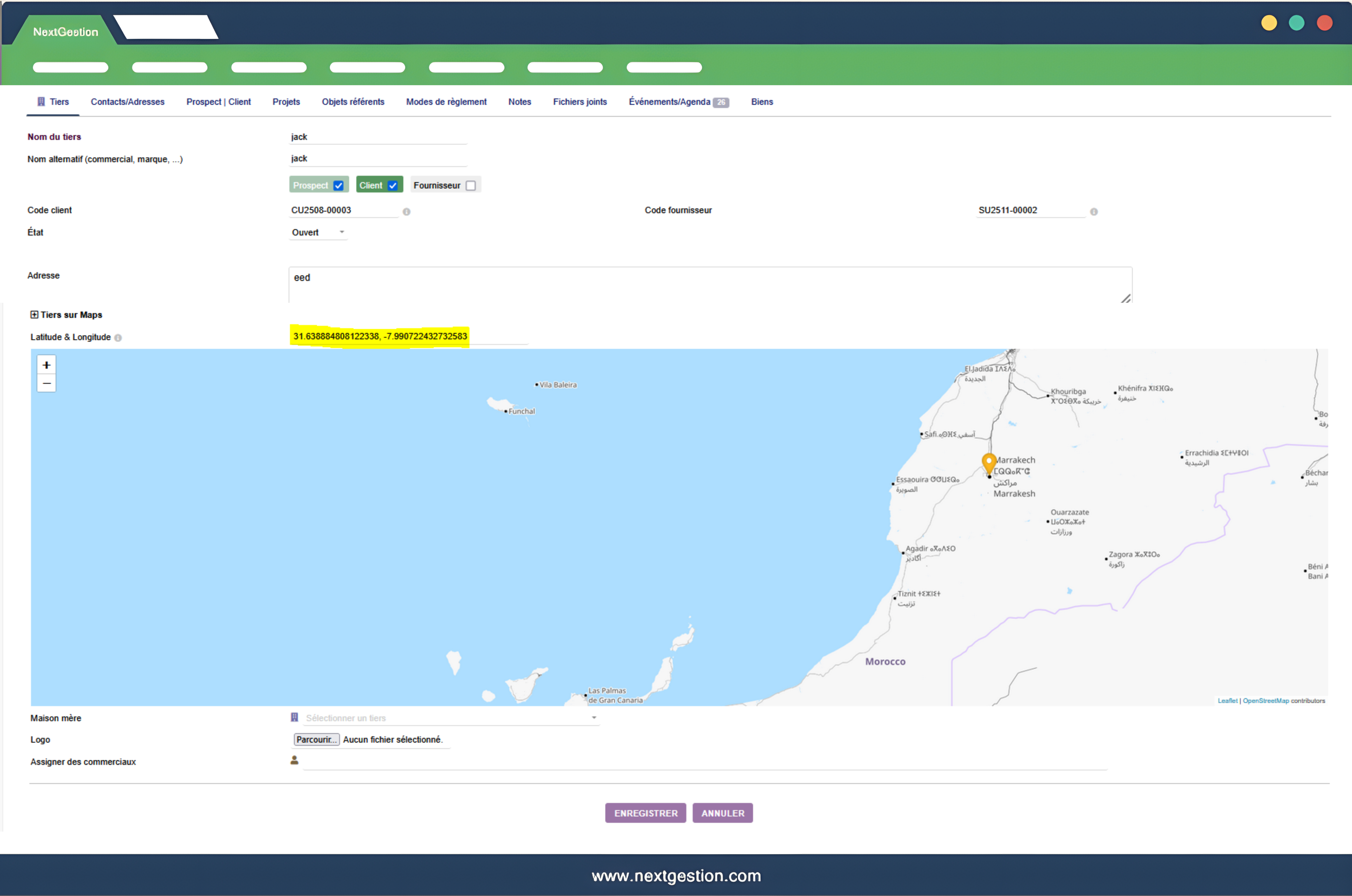 Third-party geolocation: in the Third party card, a “Third party on Maps” block to enter Latitude & Longitude and preview the pin.