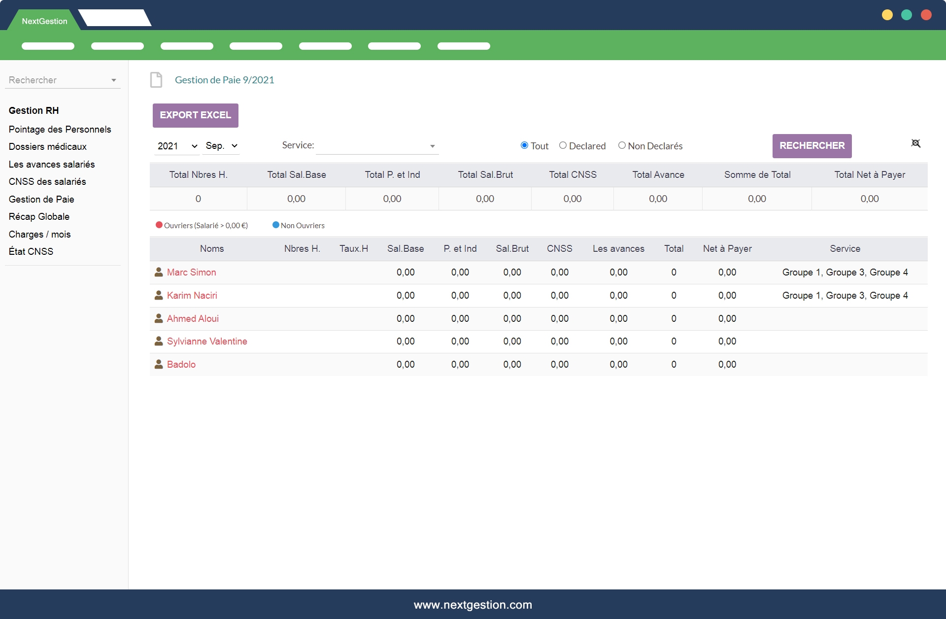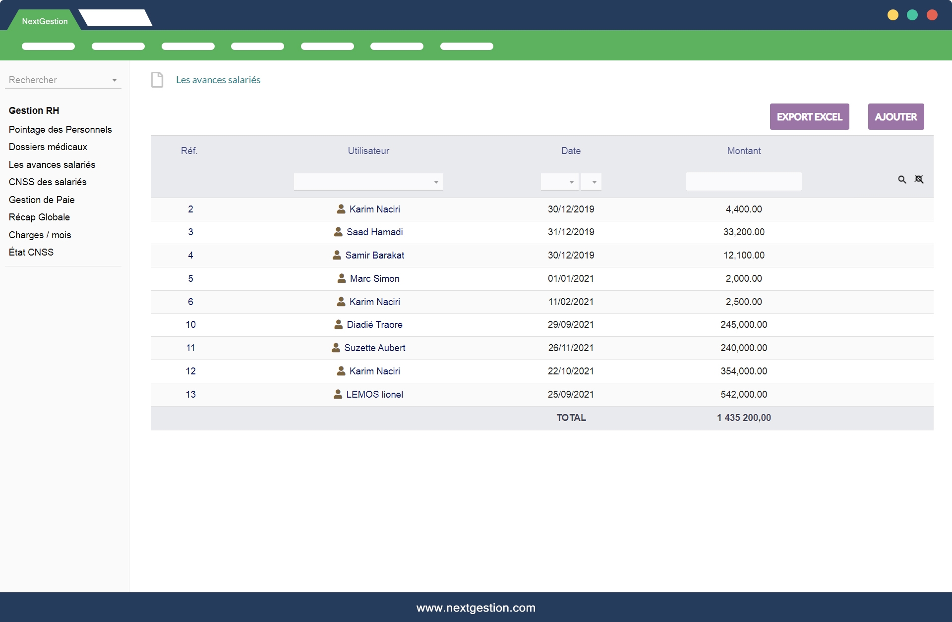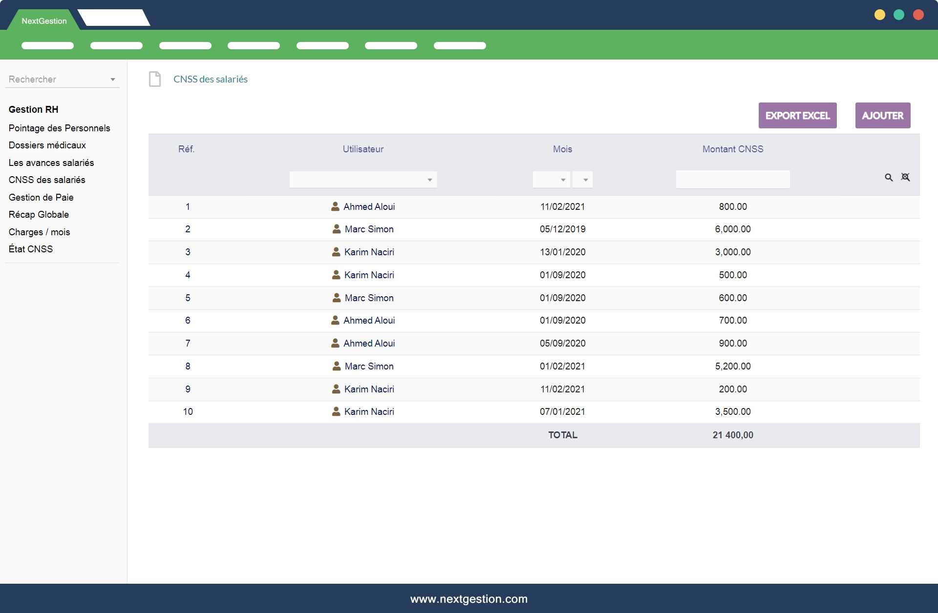 2- Medical records 3- Employee advances 4- CNSS employees 5- Payroll Management 6- Global Recap 7- Charges / month 8- CNSS State Login: demoPassword: demoIf you order our module you benefit from: