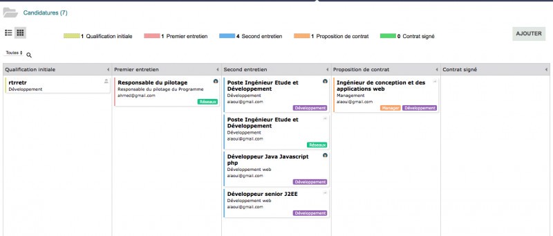 Suivi des candidatures clair et efficace. Le mode Kanban pour le recrutement est très intuitif.