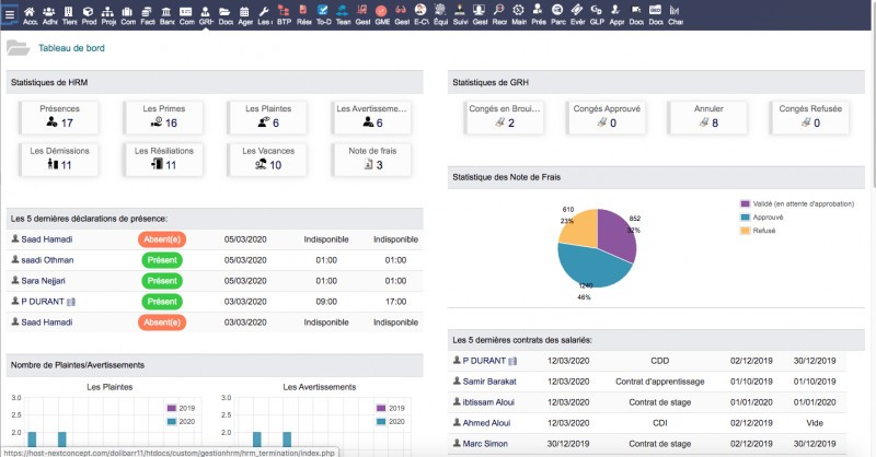 - Presence Management - Premium Management - Complaints Management - Warning Management - Resignation Management - Termination Management - Vacation Management - Recruitment Management * 1 - CV library management * 2 - Contract management: CDI - CDD - Apprenticeship - internship contracts .... * 1- The Recruitment Module for Dolibarr allows you to Manage: 1- Job offers or positions that you need Publish job offers or the positions you want to create within your company, and follow the application process in Kanban mode (Recruitment in progress, Recruitment made reliable, Recruitment stopped ...) 2- Applications Track all of your candidates (personal information, professional information, manage each candidate's score, follow the application process in Kanban mode: Initial qualification, First interview, Second interview, Contract proposal, Signed contract ... 3- CV and Letters database management Manage absolutely everything from the application, thanks to the CV and Letters sub-module you can create your own database of CVs and cover letters for your applications. 4- Automatic indexing and advanced searches Thanks to the advanced search sub-module you can easily find candidates already indexed in your database according to several criteria that you are looking for a profile. * 2- Thanks to our tool you can generate all the CVs of your employees and classify them or use them in your calls for tenders. Write your CV in 3 simple steps. Perfectly write CVs of your employees with our CV creator from Dolibarr, in just a few steps. 1. Enter your personal data First enter your personal data and any additional contact data that you wish to communicate. You can also add a photo or additional data, for example your marital status, your driver's license and your profiles on social networks and all this in the user management interface of Dolibarr. 2. Introduce your experiences. Then, continue writing your CV by introducing your studies, your professional experience, your skills, your Certificates, your Main Qualifications and your knowledge of languages, the Professional training courses followed, the internships carried out, your personal profile as well as other experiences. you want to include on your CV. 3. Select a model & Download the CV To complete your CV, select an appropriate layout from a range of professional CV templates designed. You have the choice between more than 3 different models of CV and colors. Then you can download your CV in the selected template, in pdf format. Nothing's easier! 4. Advanced CV search: Thanks to the advanced CV search function, you can easily find your candidates who meet the conditions of your choice. Login: demoPassword: demoIf you order our module you benefit from: