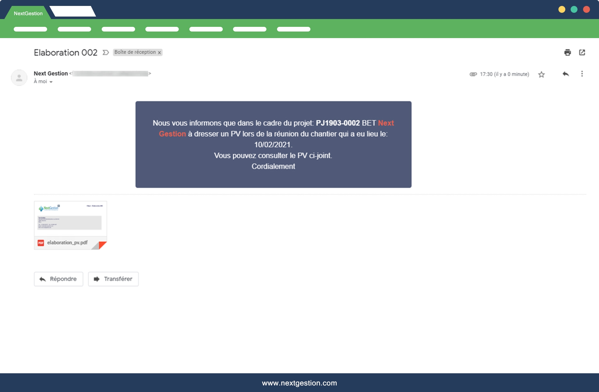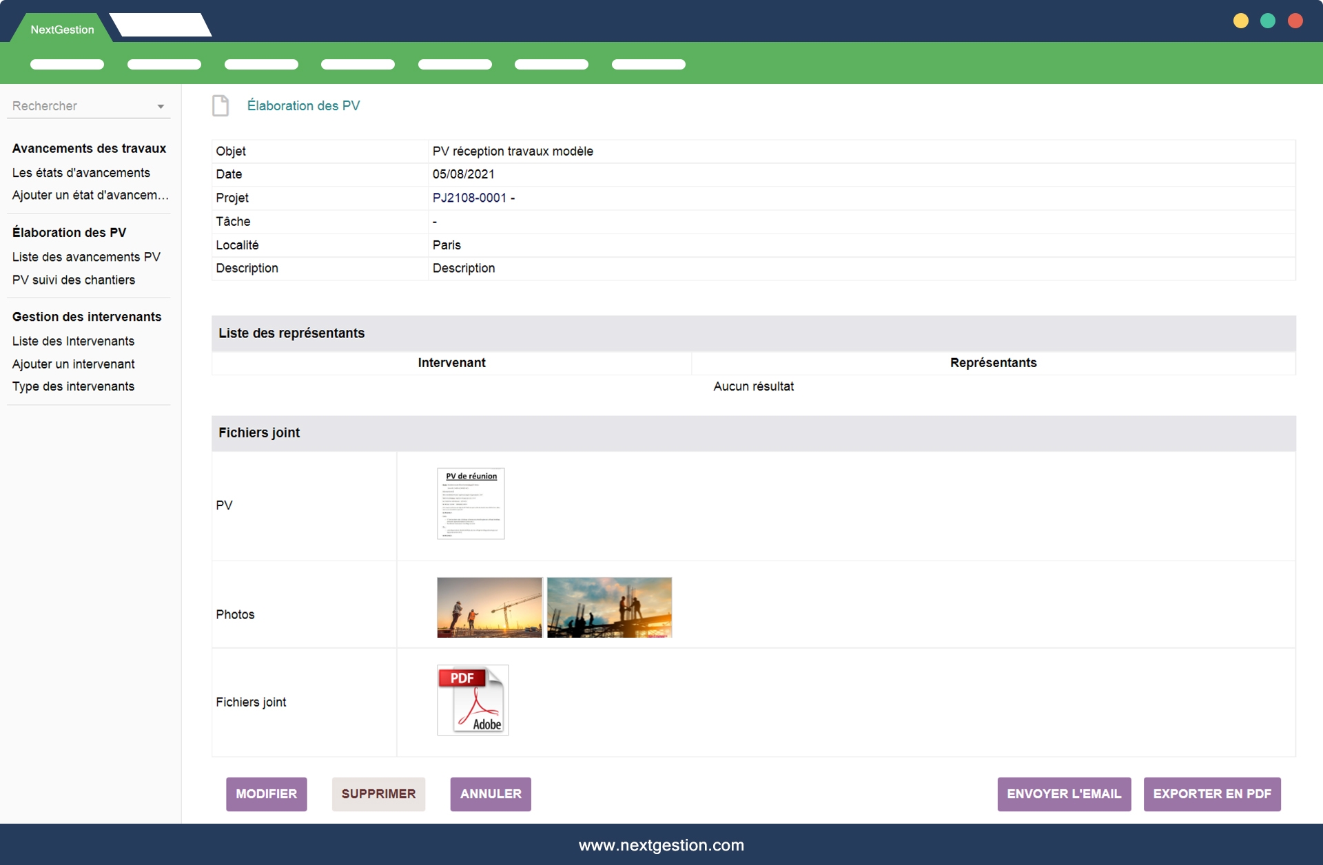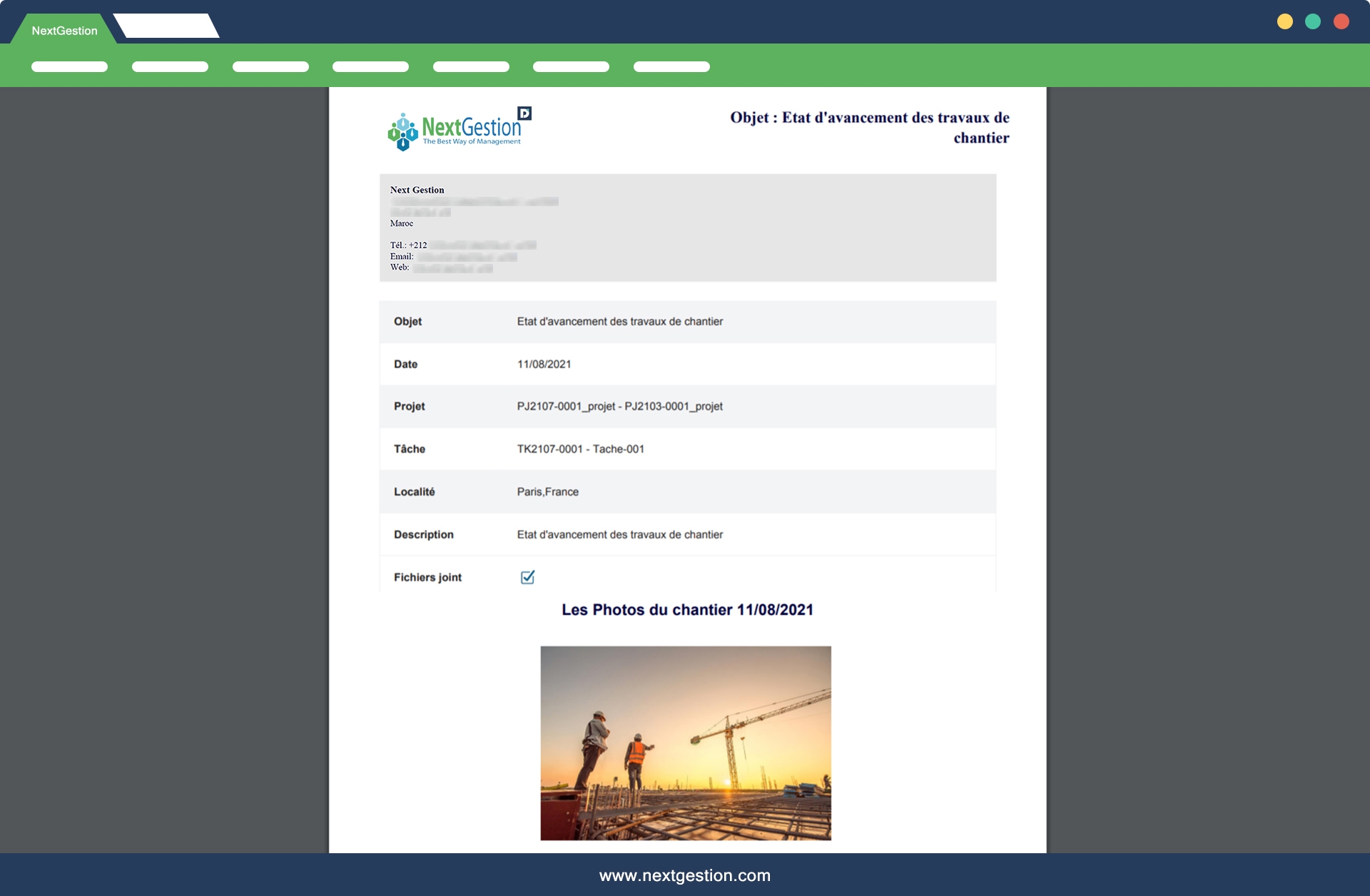 - The email of progress reports and PV to the various stakeholders on the construction site.