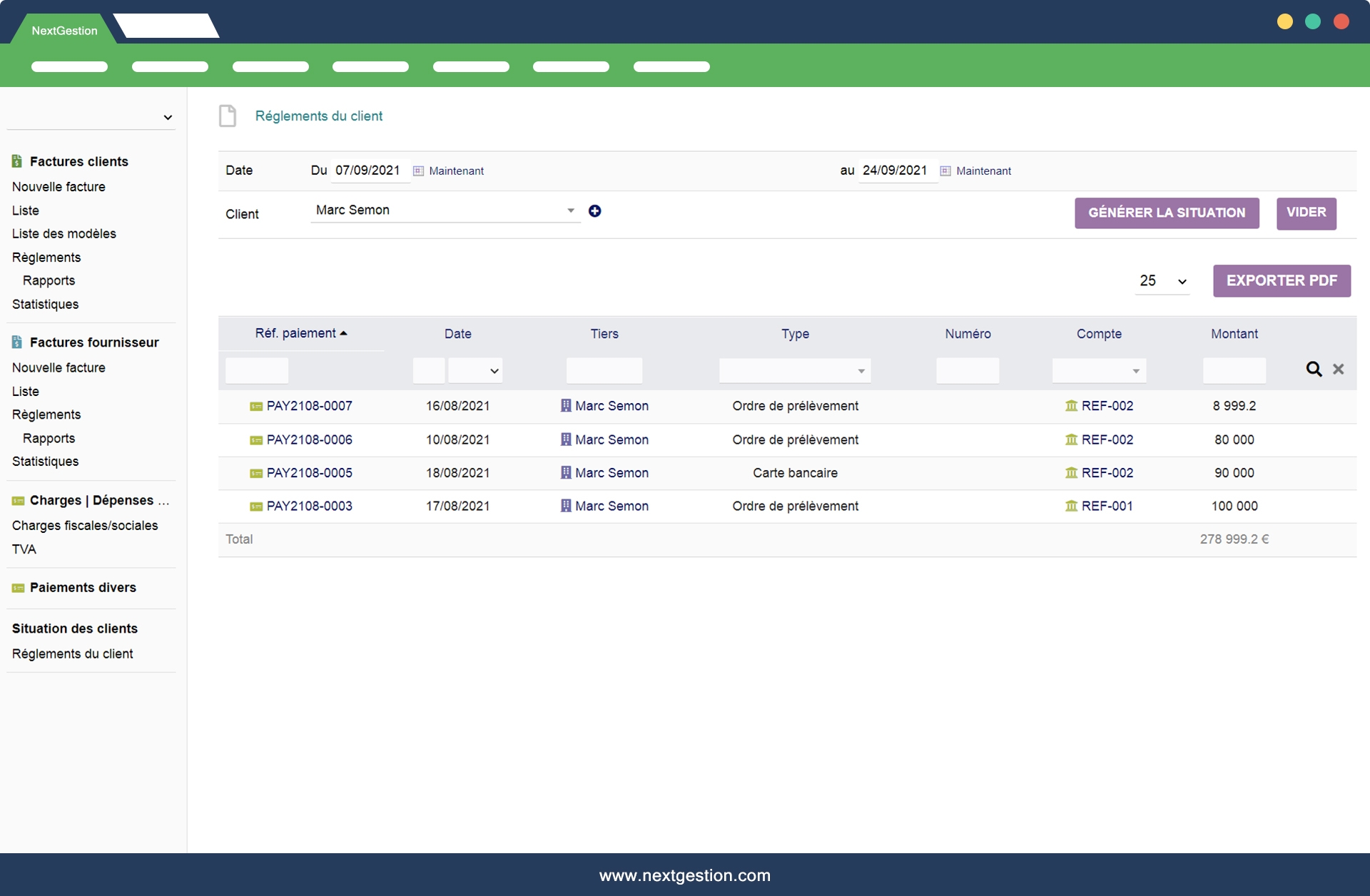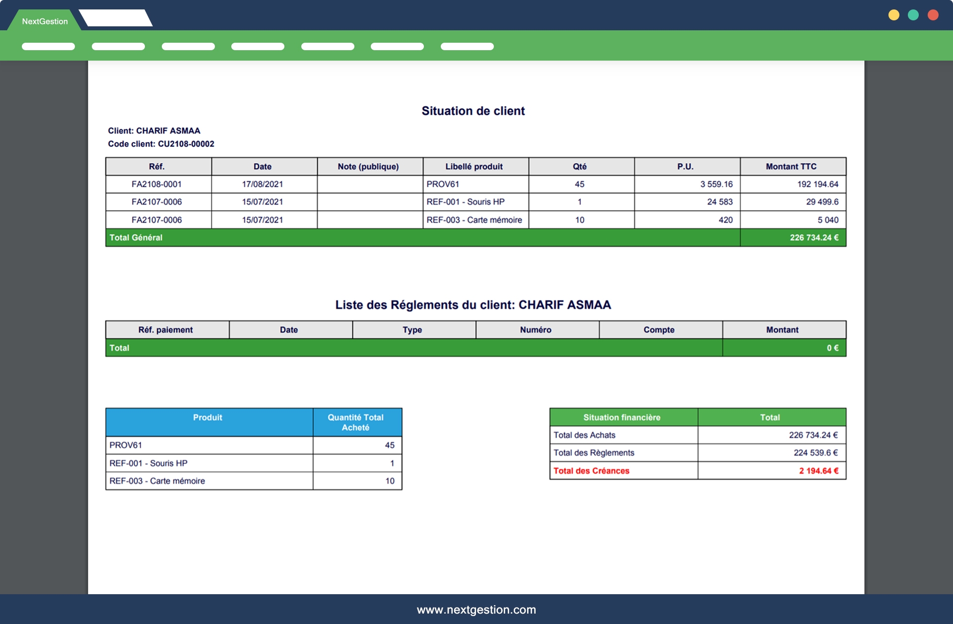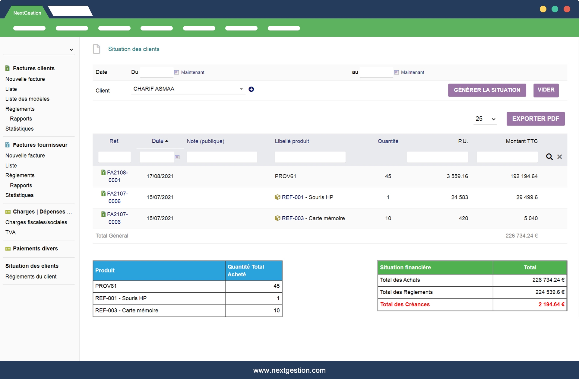 Module "Situation / Customer" allows you to know the situation of a customer with the details over a period of the products consumed with their quantities for each invoice also at the bottom of the table have the Total Invoiced of these Purchases - the Total of these Payments - the Quantity of products Purchased - The Total of its Receivables.