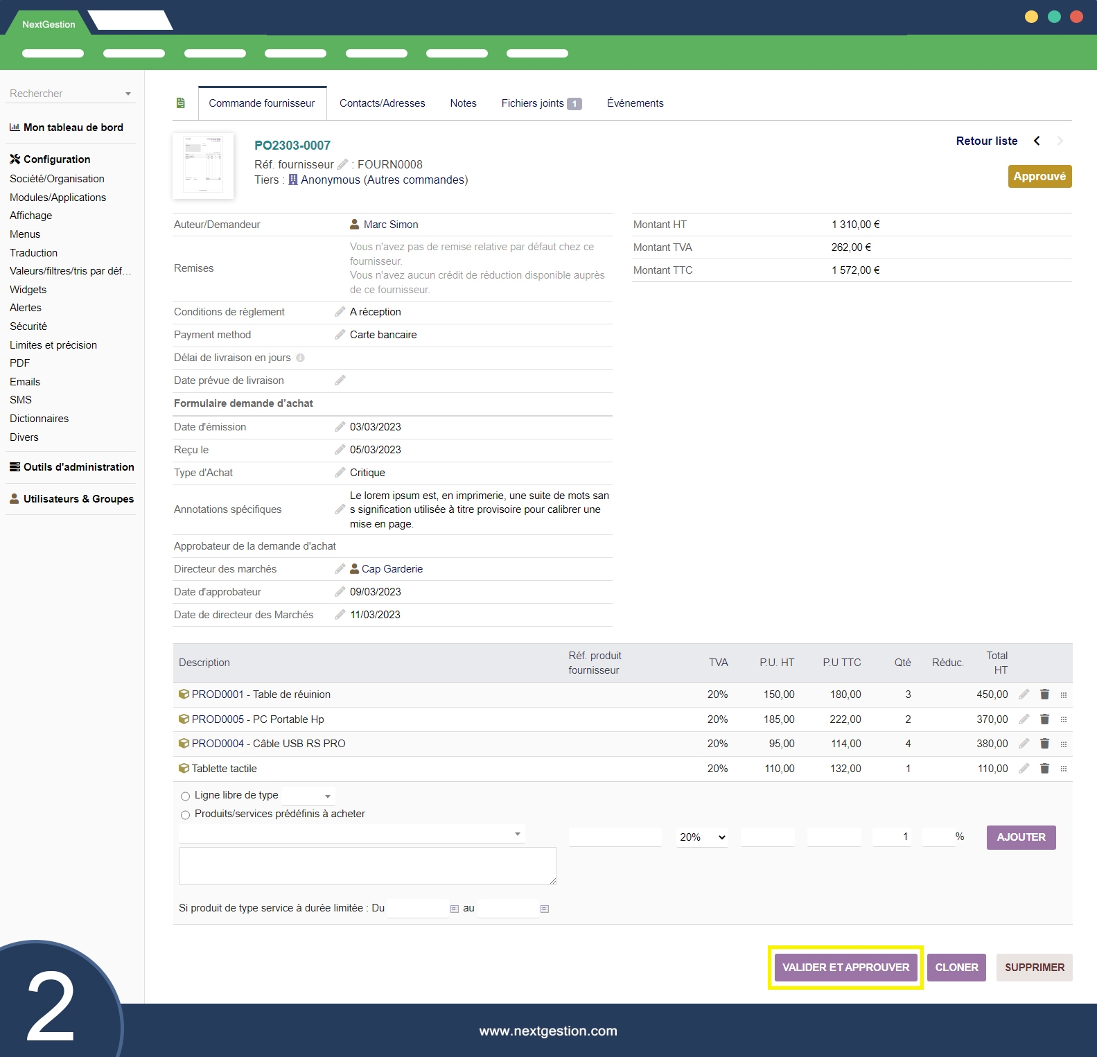 Validar y aprobar la solicitud de compra desde la orden de compra: esta función permite a los gerentes o miembros autorizados del equipo revisar, validar y aprobar las solicitudes de compra enviadas. Una vez aprobadas, las RFQ se pueden convertir en órdenes de compra para pasar al siguiente paso del proceso de compra.
