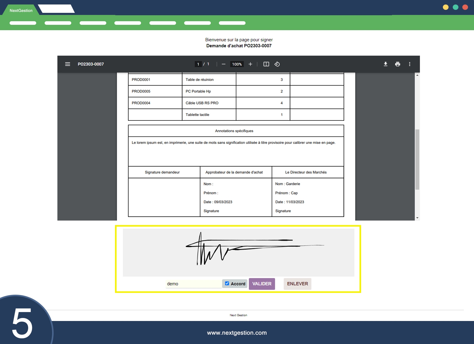 Firmar electrónicamente la solicitud de compra: La firma electrónica permite a los usuarios autorizados aprobar formalmente las solicitudes de compra agregando su firma digital al documento. Esto garantiza la autenticidad de la aprobación y proporciona un registro de auditoría claro para las transacciones.