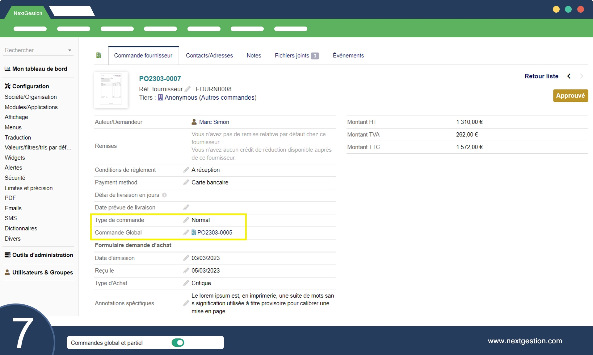 Vincular pedidos de proveedores parciales a pedidos de proveedores globales: Esta funcionalidad permite a los usuarios gestionar pedidos de proveedores compuestos por varias entregas parciales. Los pedidos parciales se pueden vincular al pedido general, lo que facilita la gestión, el seguimiento y la recepción de los productos solicitados.