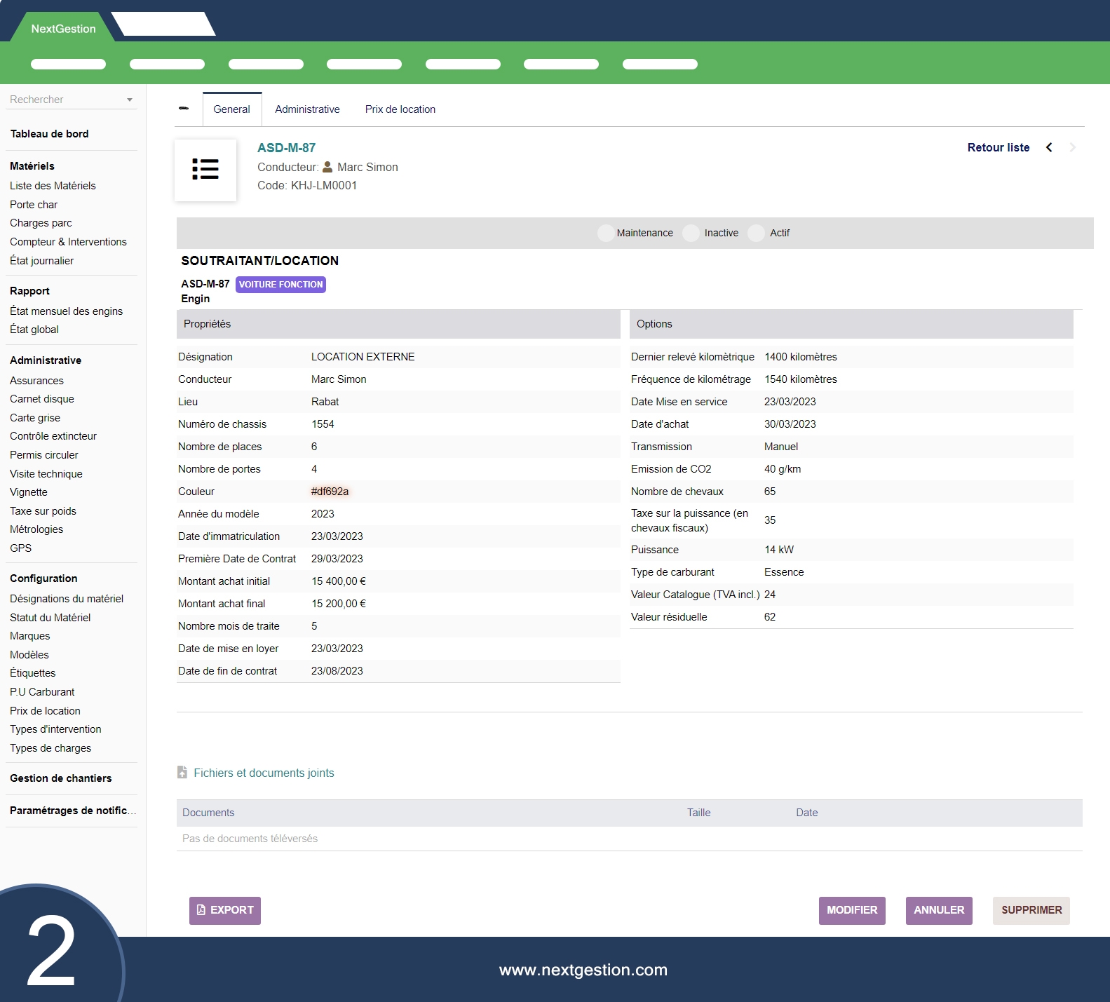 La sección administrativa centraliza los documentos administrativos y la información relacionada con equipos y materiales, tales como seguros, libros de registro, documentos de registro de vehículos, controles de extintores, permisos de conducción, inspecciones técnicas, viñetas, impuestos sobre el peso y metrología.