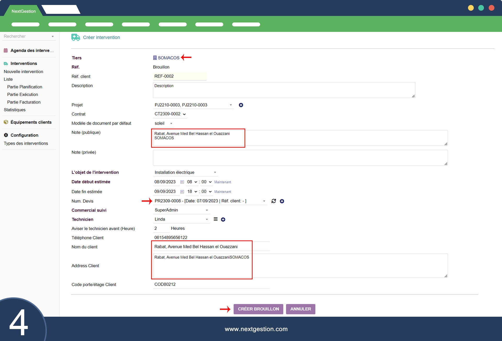 Detalles de cotización: Asocie la intervención con un número de cotización para una gestión simplificada.