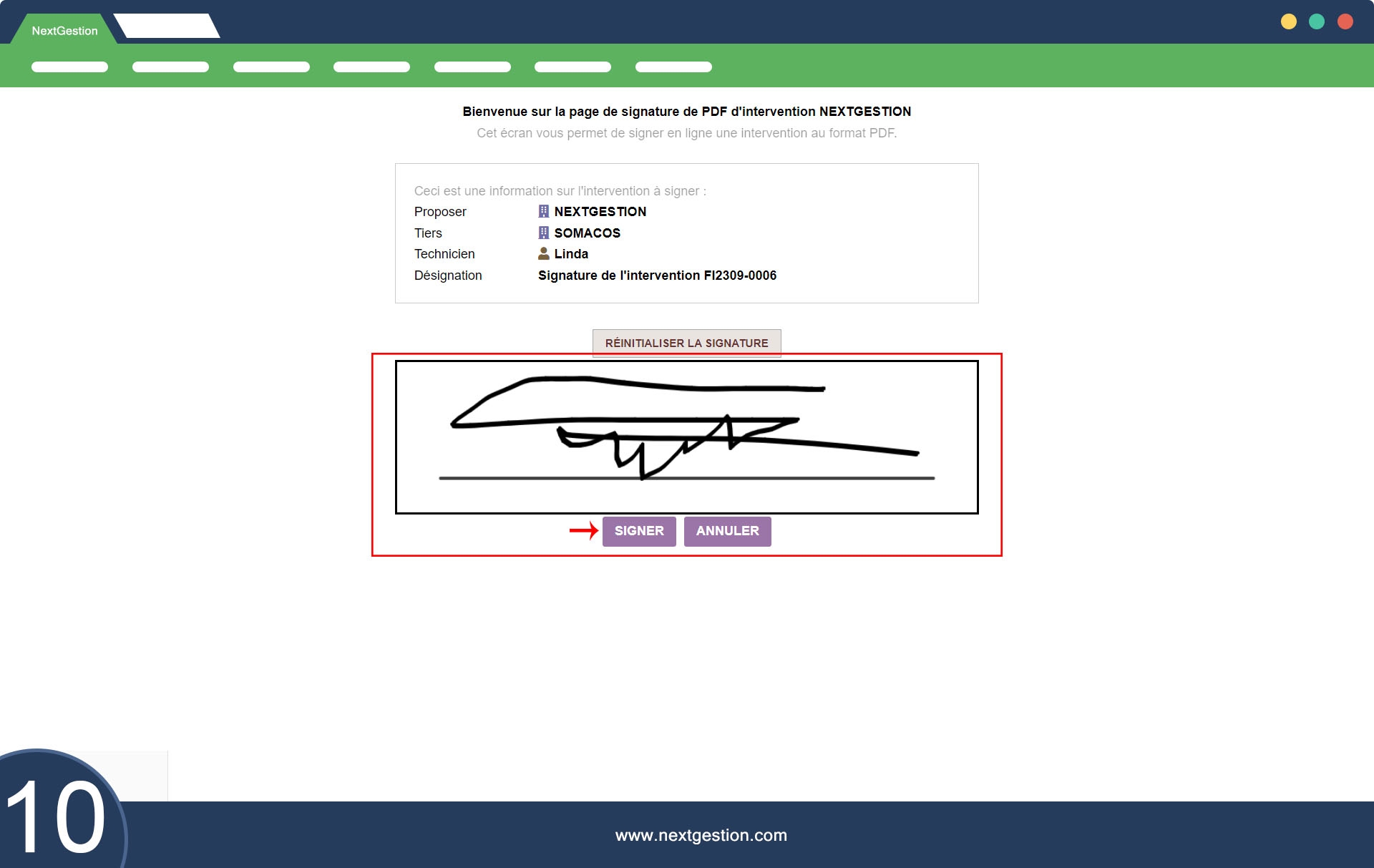 Finalización de la Intervención: Seleccionar el estado de la intervención (a facturar, a cotizar, sin actuación) y obtener la firma electrónica del técnico y del cliente (obligatorio).