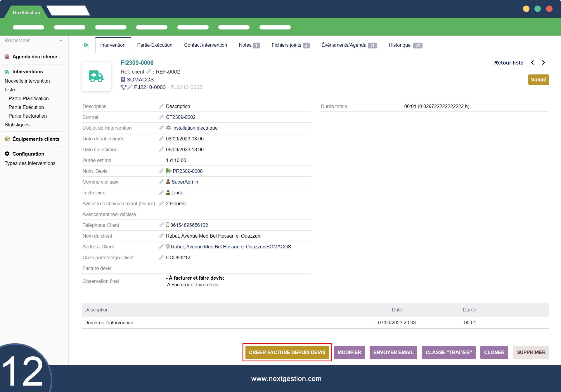 Notificación al gerente: la elección del estado de la intervención activa automáticamente una notificación por correo electrónico al gerente de tareas para iniciar la facturación o el cálculo de costos.