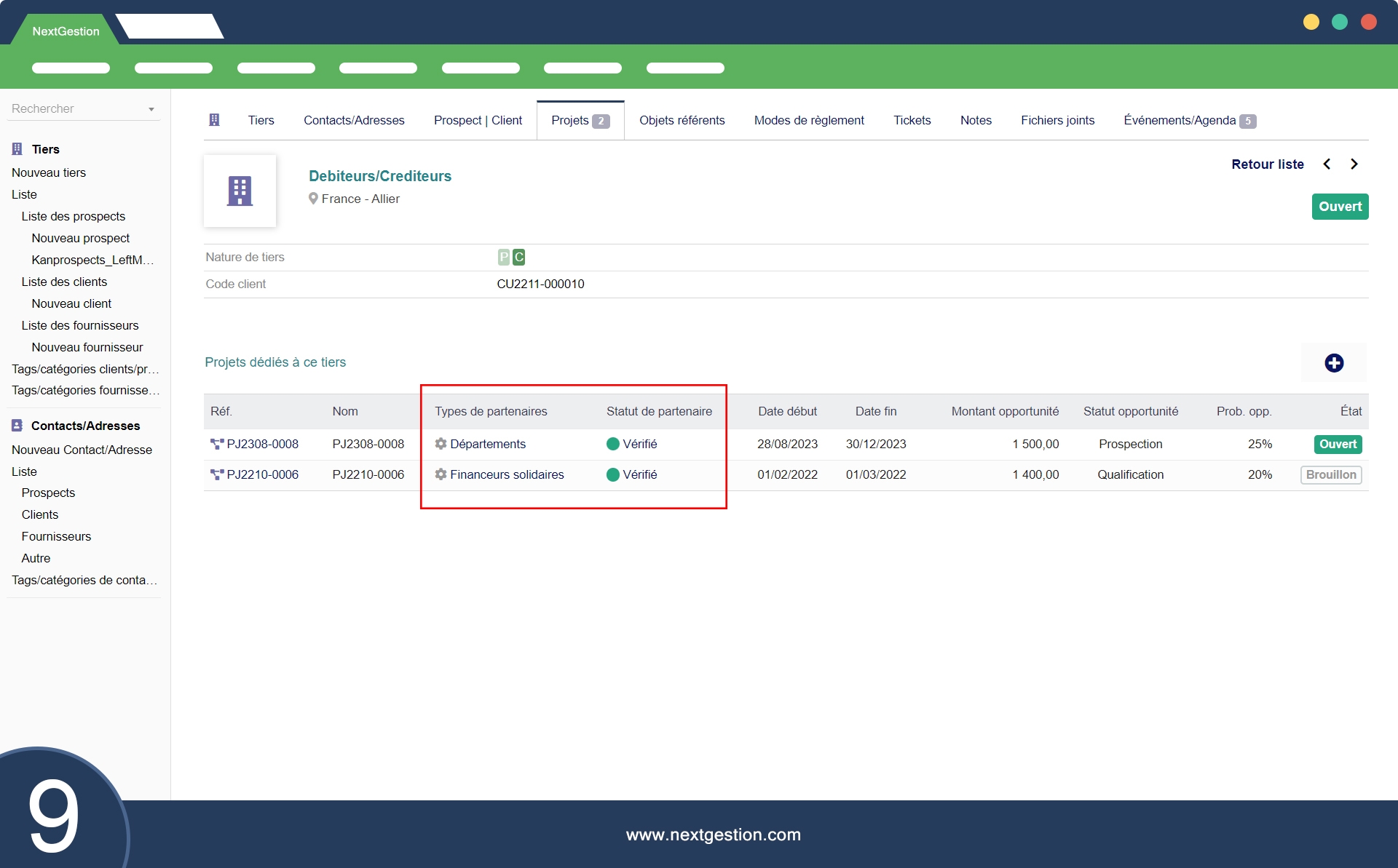 Hemos desarrollado un módulo llamado "Socios de Proyecto" que estará vinculado al módulo de Proyectos. Este módulo permitirá asociar varios terceros a un solo proyecto. Todos los proyectos conectados a terceros también serán visibles en el perfil de terceros en la pestaña "Proyectos".