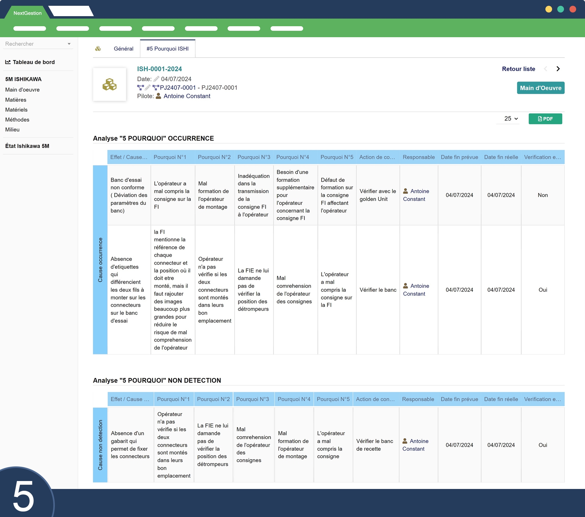 Hemos combinado las 5 M (Mano de obra, Métodos, Material, Máquinas, Medio Ambiente) con el método de los 5 porqués, uno puede profundizar más para comprender por qué ocurre realmente un problema.
