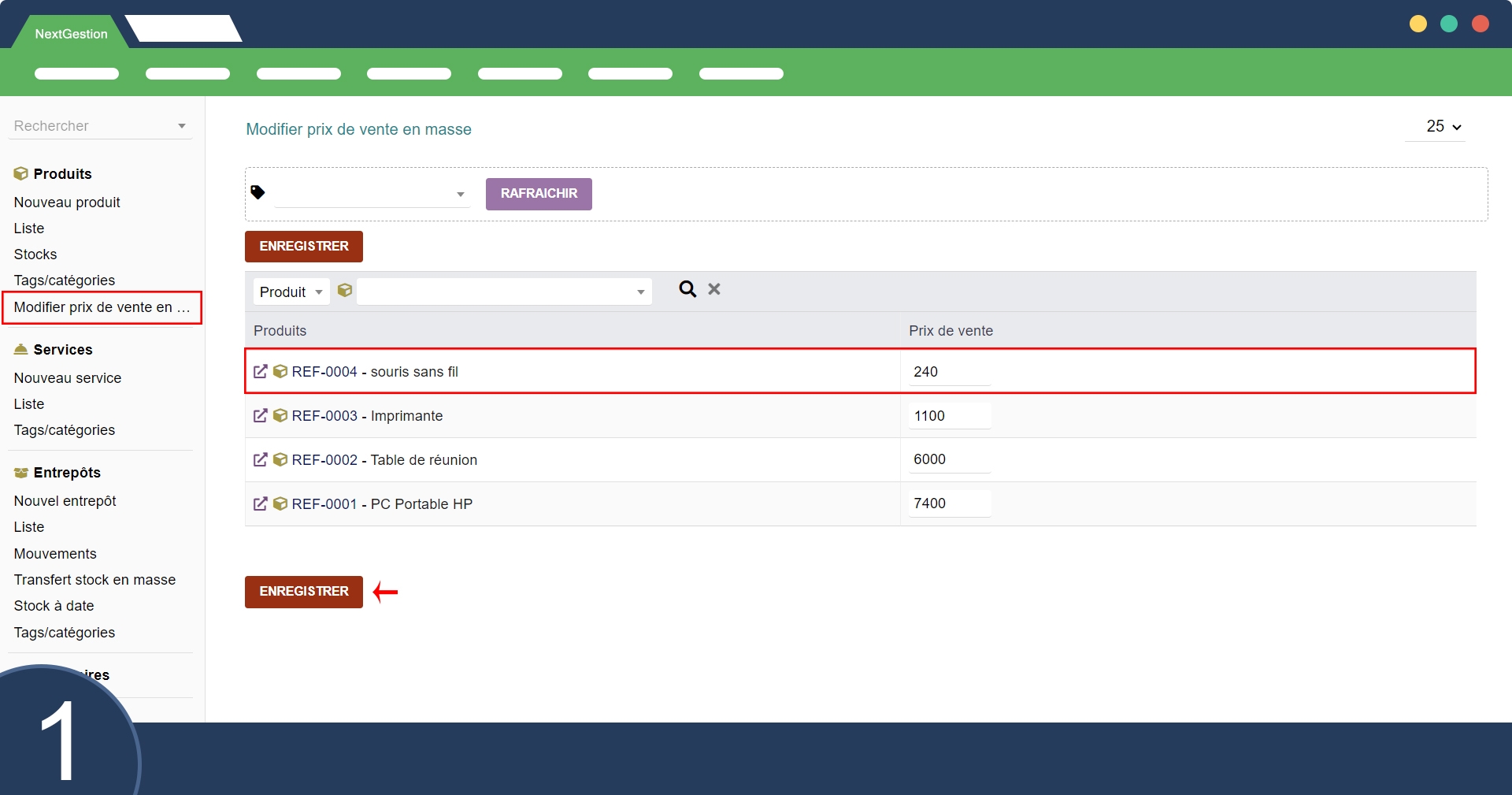 Es posible seleccionar los productos cuyos precios deben cambiarse en masa. La interfaz enumera los productos con sus precios de venta actuales y permite a los usuarios ingresar los nuevos precios directamente en los campos correspondientes.