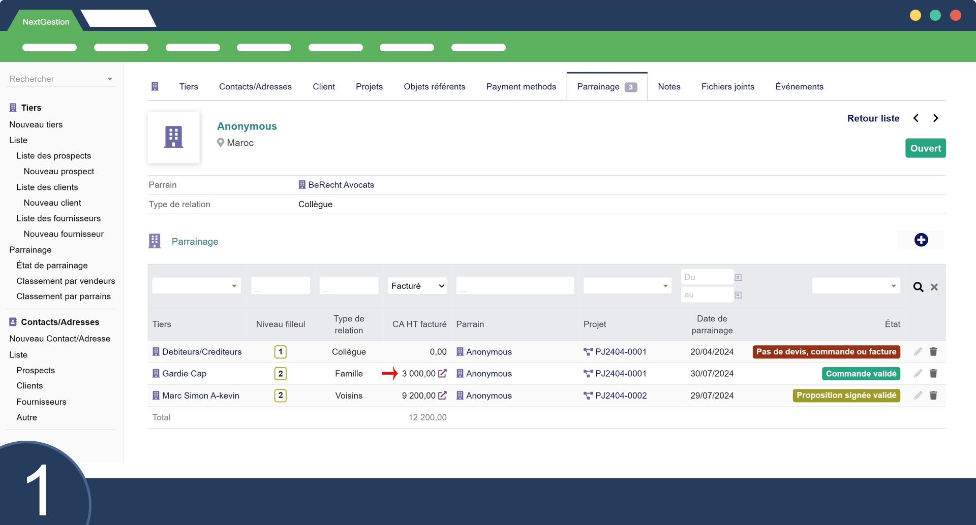Un panel le permite visualizar las relaciones de patrocinio, con detalles de las transacciones asociadas (por ejemplo, importes facturados, proyectos vinculados, etc.).