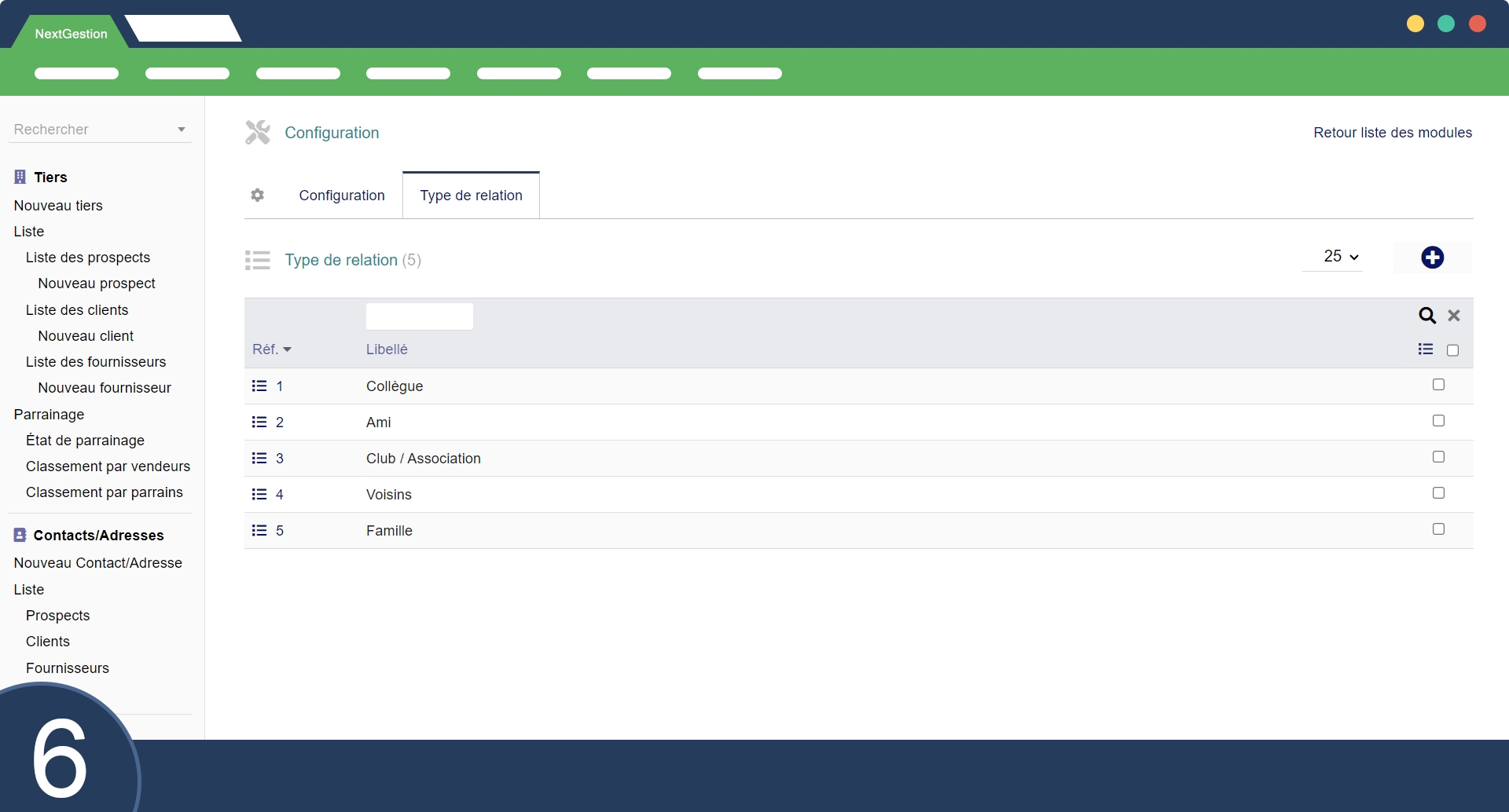 El administrador puede configurar los niveles de patrocinio (hasta 4 niveles de referencias), así como los tipos de relaciones entre terceros (colega, familia, vecino, etc.).