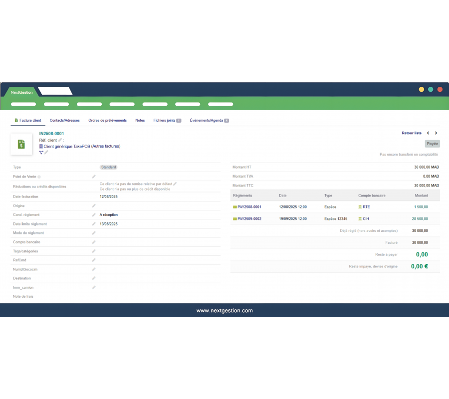 Con TakePOS se genera y se cobra diariamente un gran número de facturas de caja: al final del turno, un solo clic permite confirmar todas las facturas saldadas. Después de registrar anticipos y pagos finales, puedes actualizar rápidamente el estado de las facturas afectadas. Antes de la exportación contable, te aseguras de que todas las facturas completamente pagadas estén correctamente marcadas como «Pagada».