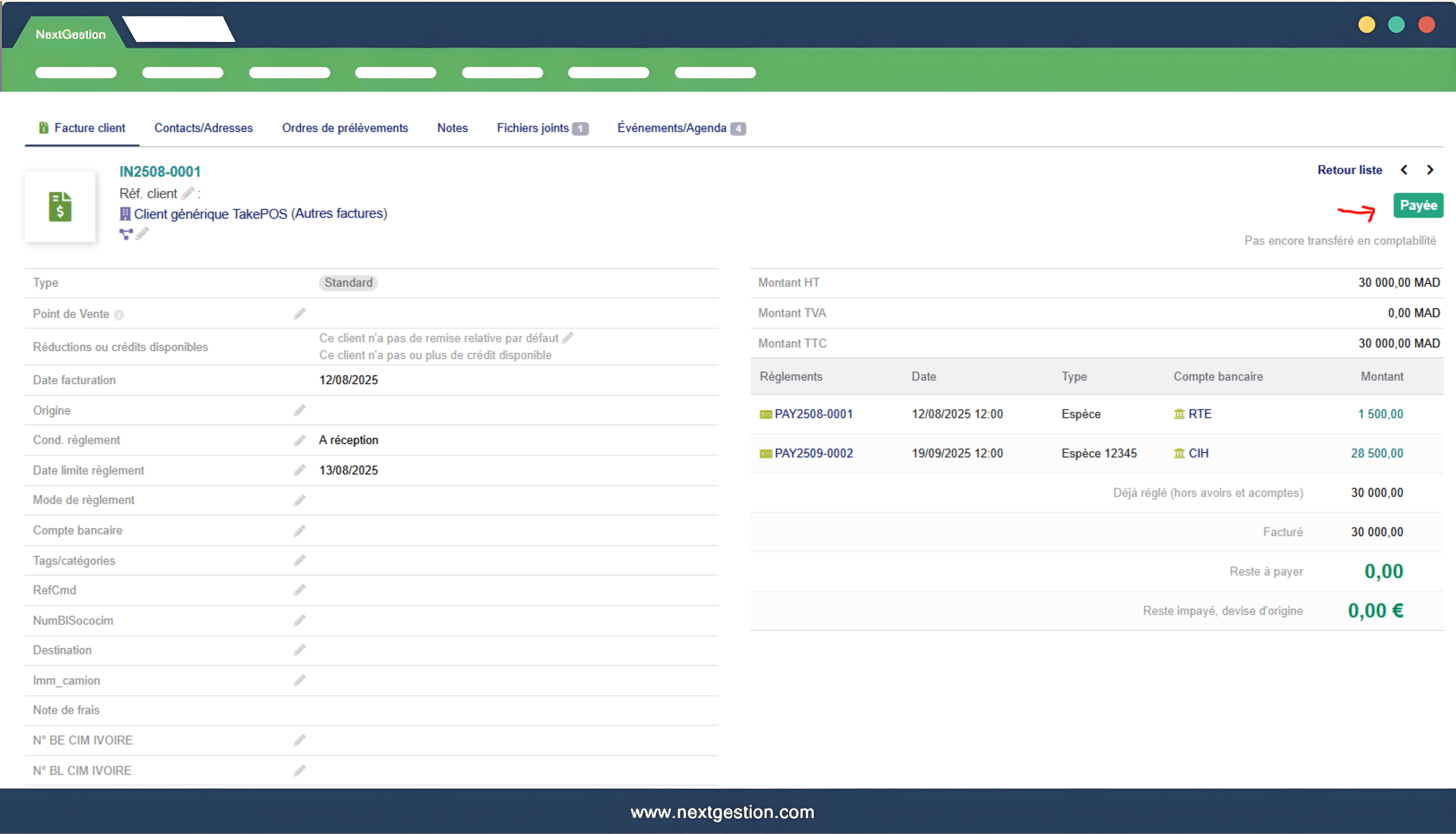 El módulo «Confirmar el pago de factura de cliente» para Dolibarr automatiza la actualización del estado de las facturas de clientes en cuanto el importe ha sido pagado por completo. En la lista de facturas, puedes confirmar de una sola vez el pago de varias facturas ya abonadas (TakePOS, pagos manuales, importaciones bancarias, etc.) sin tener que abrir cada factura una por una.