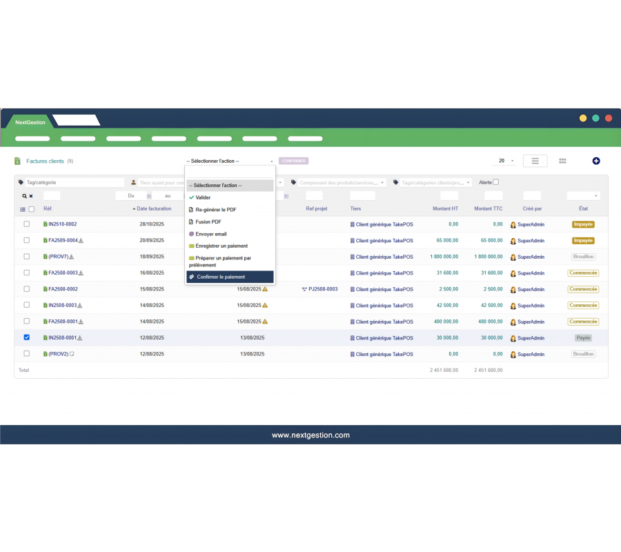 Acción masiva «Confirmar el pago» en la lista de facturas de clientes, comprobación automática del importe pendiente, cambio al estado Pagada solo si la factura está totalmente saldada, conservación íntegra del historial de pagos y compatibilidad con facturas procedentes de TakePOS o de cualquier otro proceso de registro de pagos en Dolibarr.