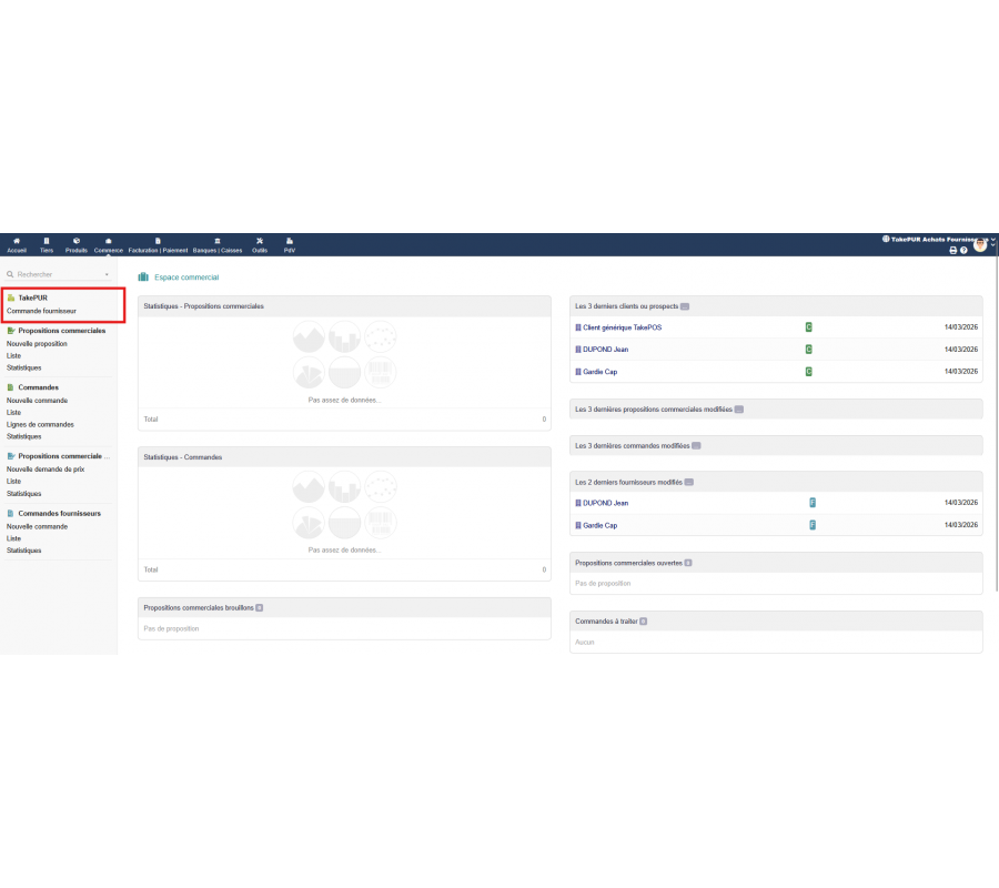 TakePUR aporta a Dolibarr ERP CRM una interfaz moderna y ultra rápida para la creación de pedidos a proveedores, inspirada en la experiencia fluida de TakePOS.