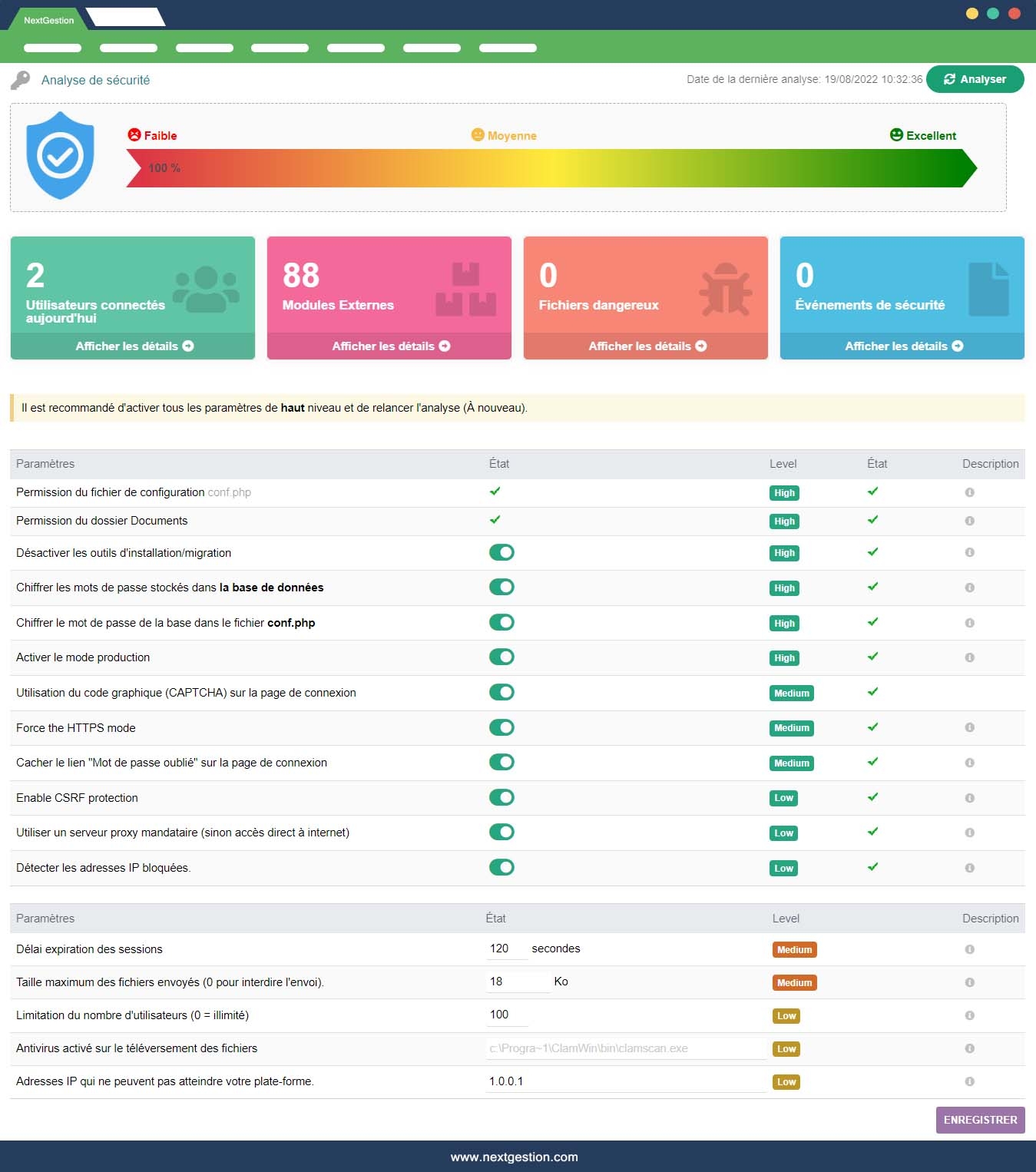 Le plugin Sécurité Dolibarr vous montre dans un tableau de bord tous les indicateurs nécessaires pour connaître le niveau de sécurité de votre plateforme et l'indique comme le fait un antivirus : sécurité faible, moyenne ou forte;