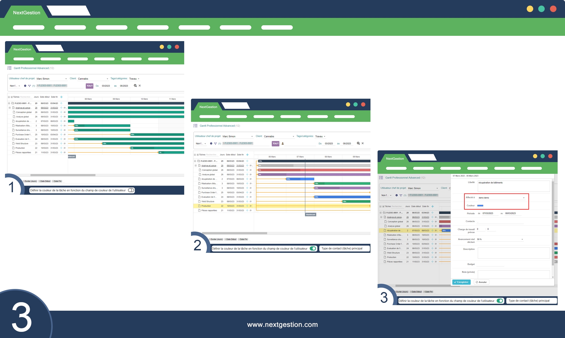 Progression et couleur de chaque tâche pour un suivi efficace des tâches à accomplir, en cours et terminées.