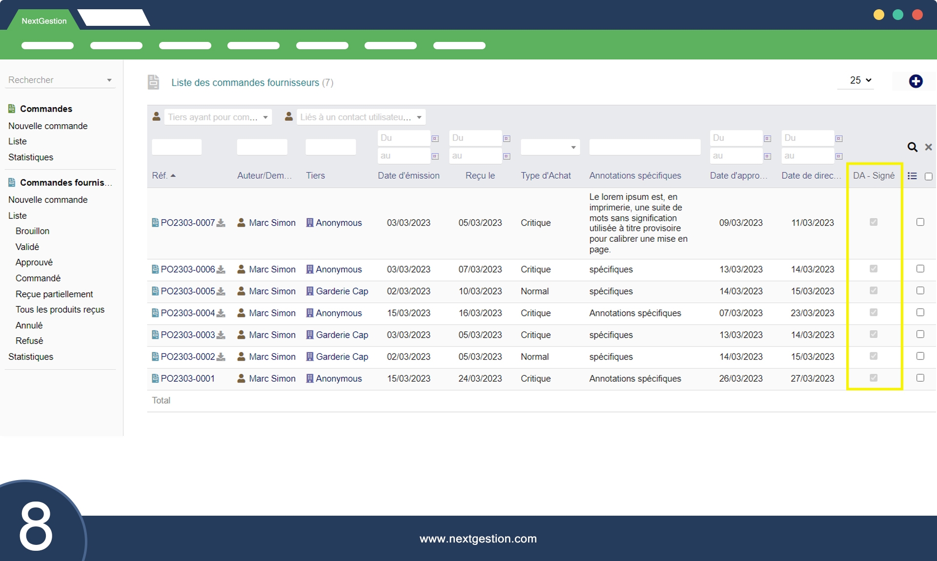 Attachez les commandes fournisseurs partiels aux commandes fournisseurs globales : Cette fonctionnalité permet aux utilisateurs de gérer les commandes fournisseurs composées de plusieurs livraisons partielles. Les commandes partielles peuvent être liées à la commande globale, facilitant ainsi la gestion, le suivi et la réception des marchandises commandées.