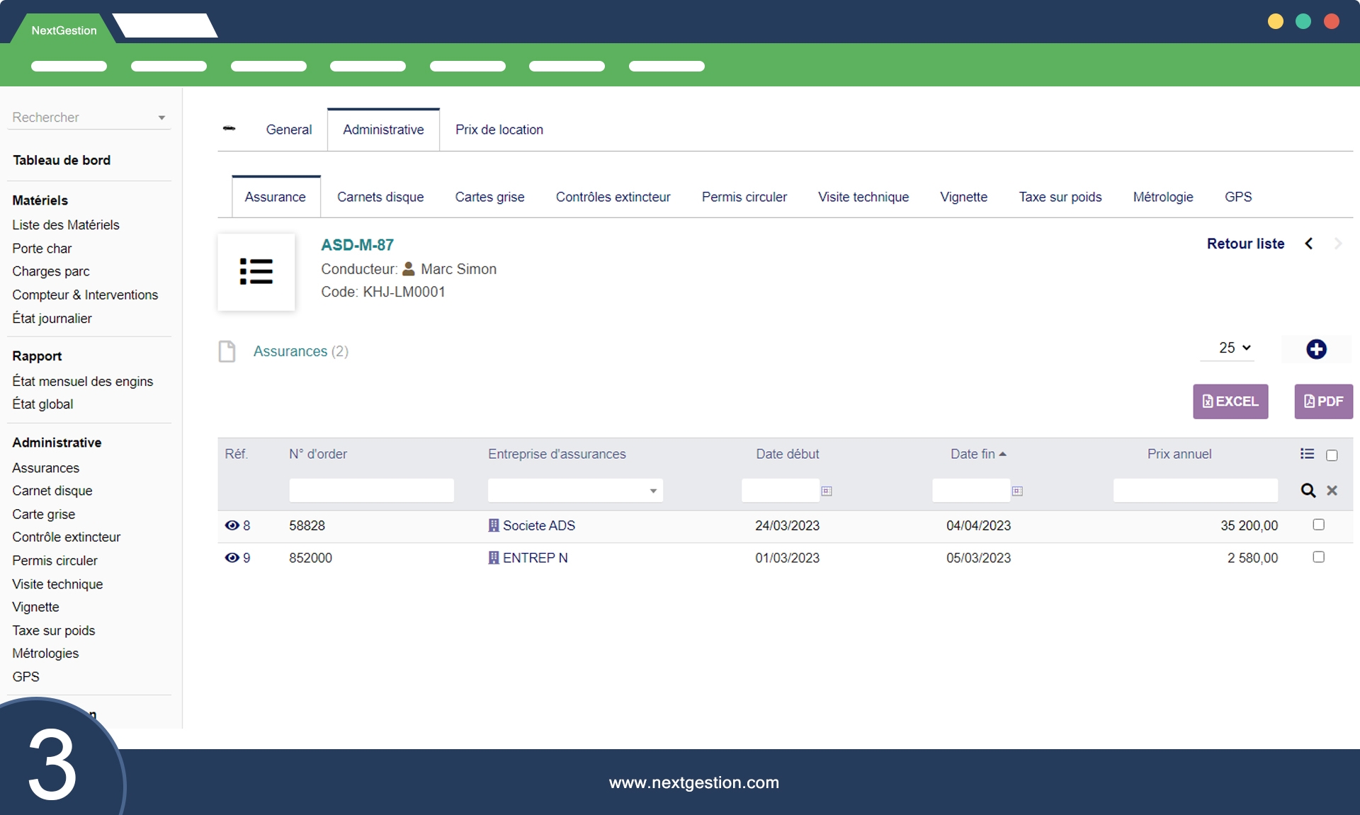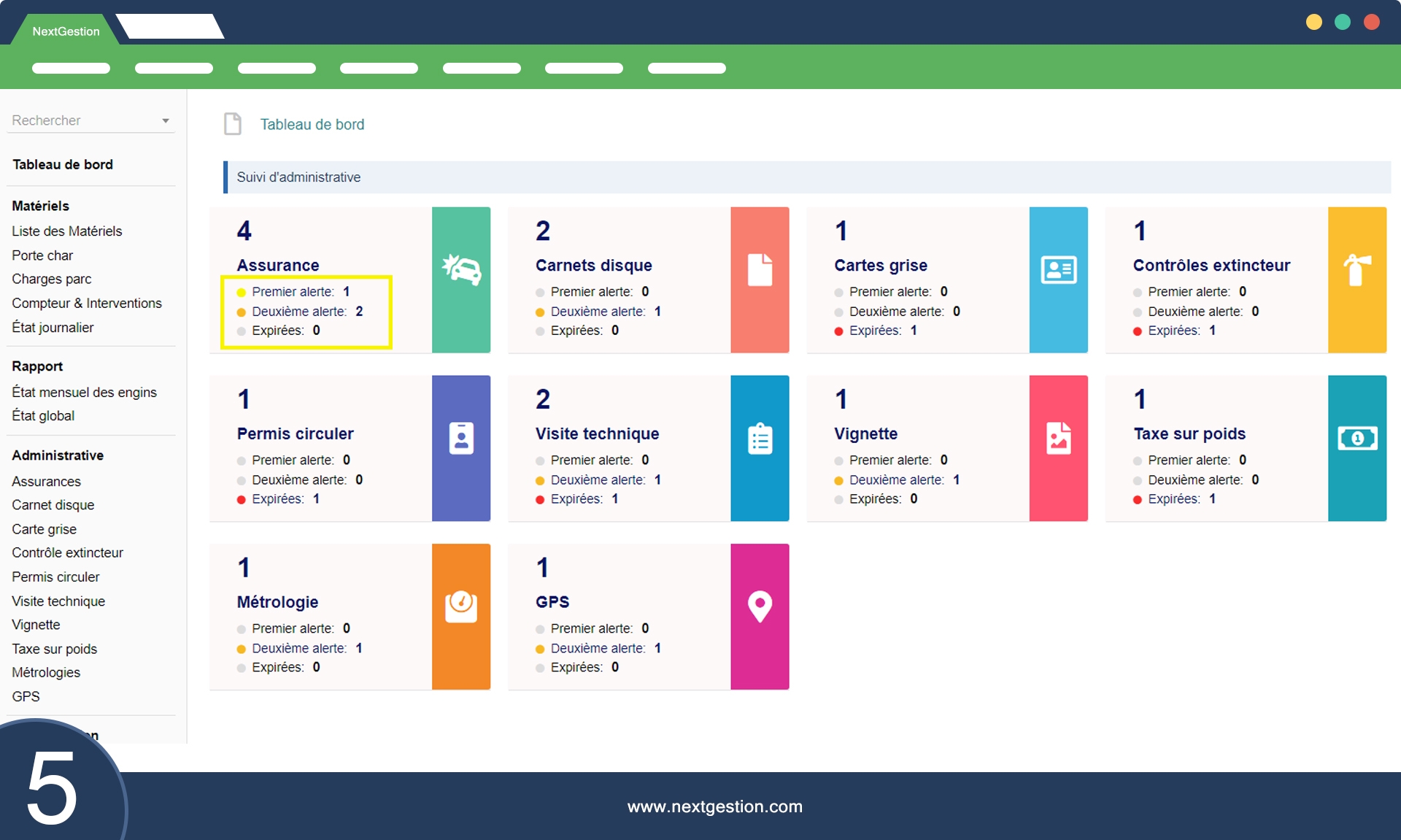 La section administrative centralise les documents et informations administratives liés aux équipements et matériels, tels que les assurances, les carnets de disques, les cartes grises, les contrôles d'extincteurs, les permis de circuler, les visites techniques, les vignettes, les taxes sur le poids et les métrologies.