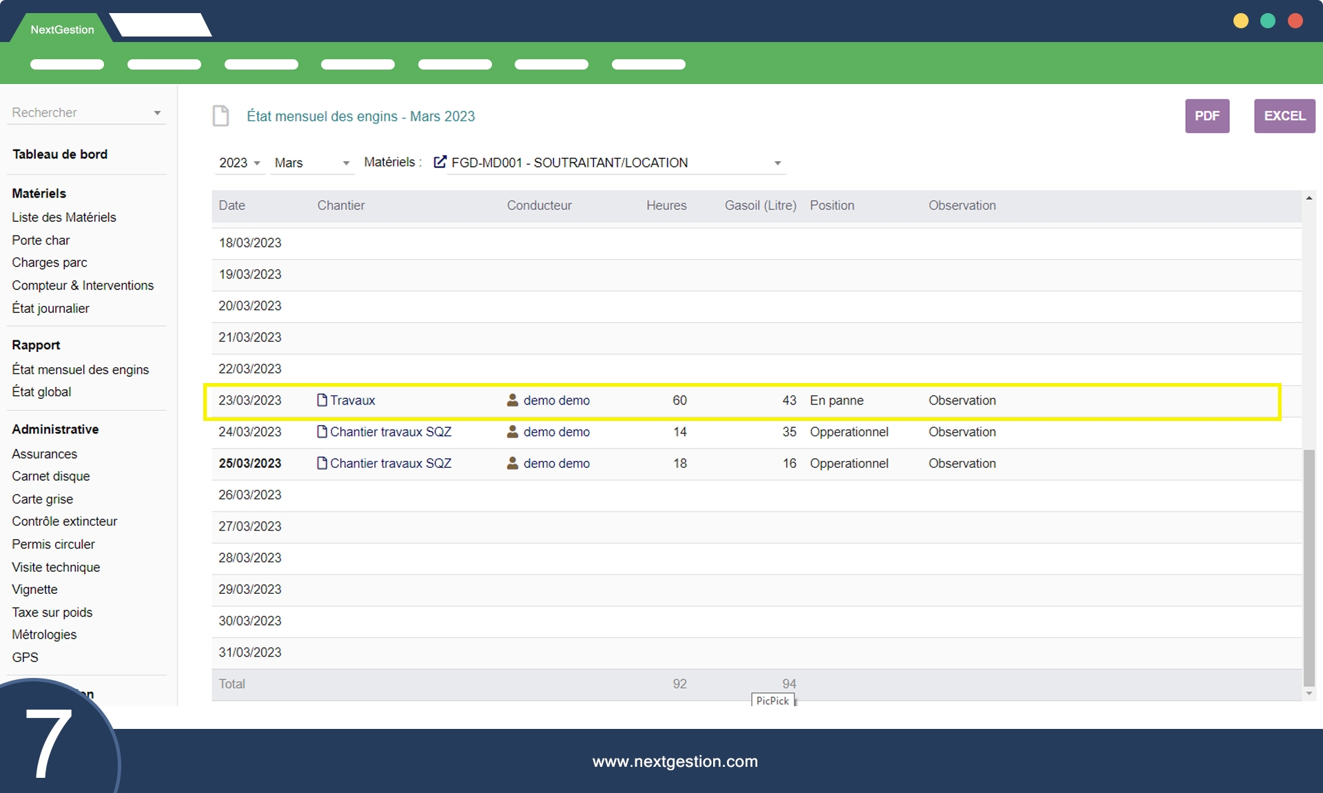 Les rapports fournissent des informations détaillées sur l'état des équipements et des matériels, permettant ainsi une analyse approfondie et une prise de décision éclairée. Les rapports incluent l'état mensuel des engins et l'état global du parc matériel.