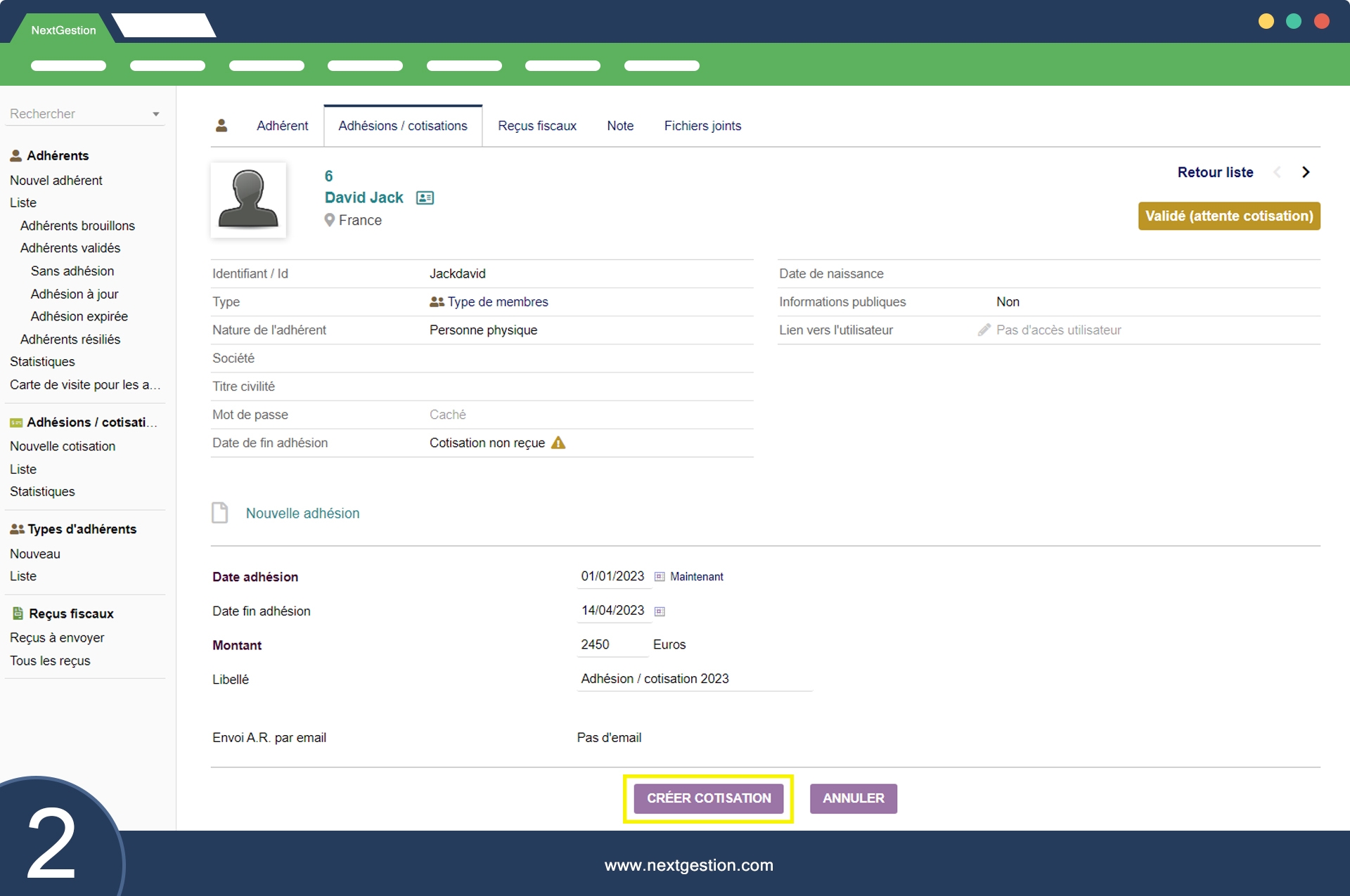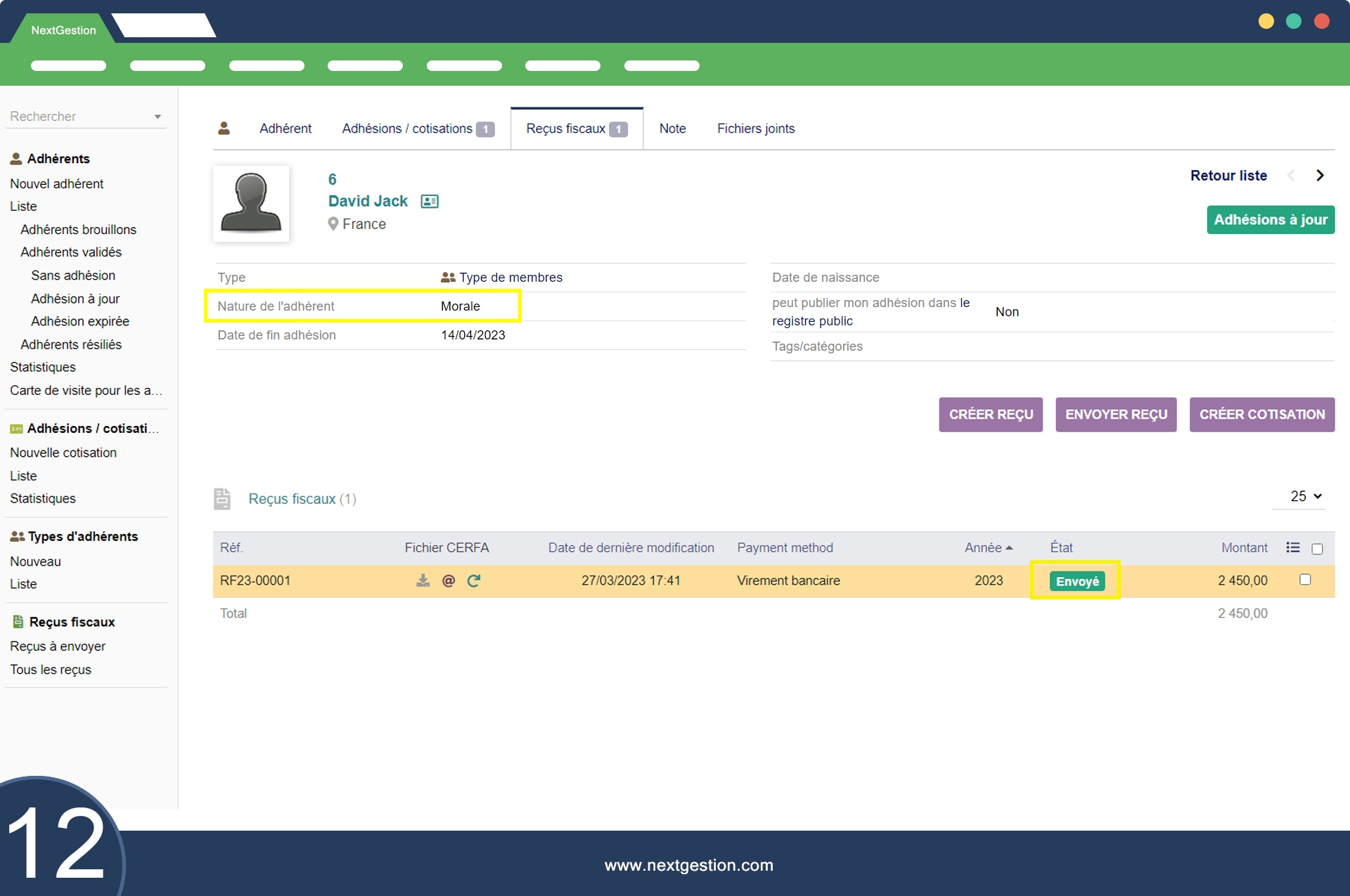 Les informations contenues dans chaque reçu fiscal incluent les données du fichier CERFA, ce qui garantit la conformité fiscale du document. En outre, chaque reçu fiscal comprend également des informations relatives au mode de paiement utilisé pour régler la cotisation (virement bancaire, versement, etc.), ainsi que le montant de la réception fiscale. La date de l'opération est également incluse dans le reçu fiscal.