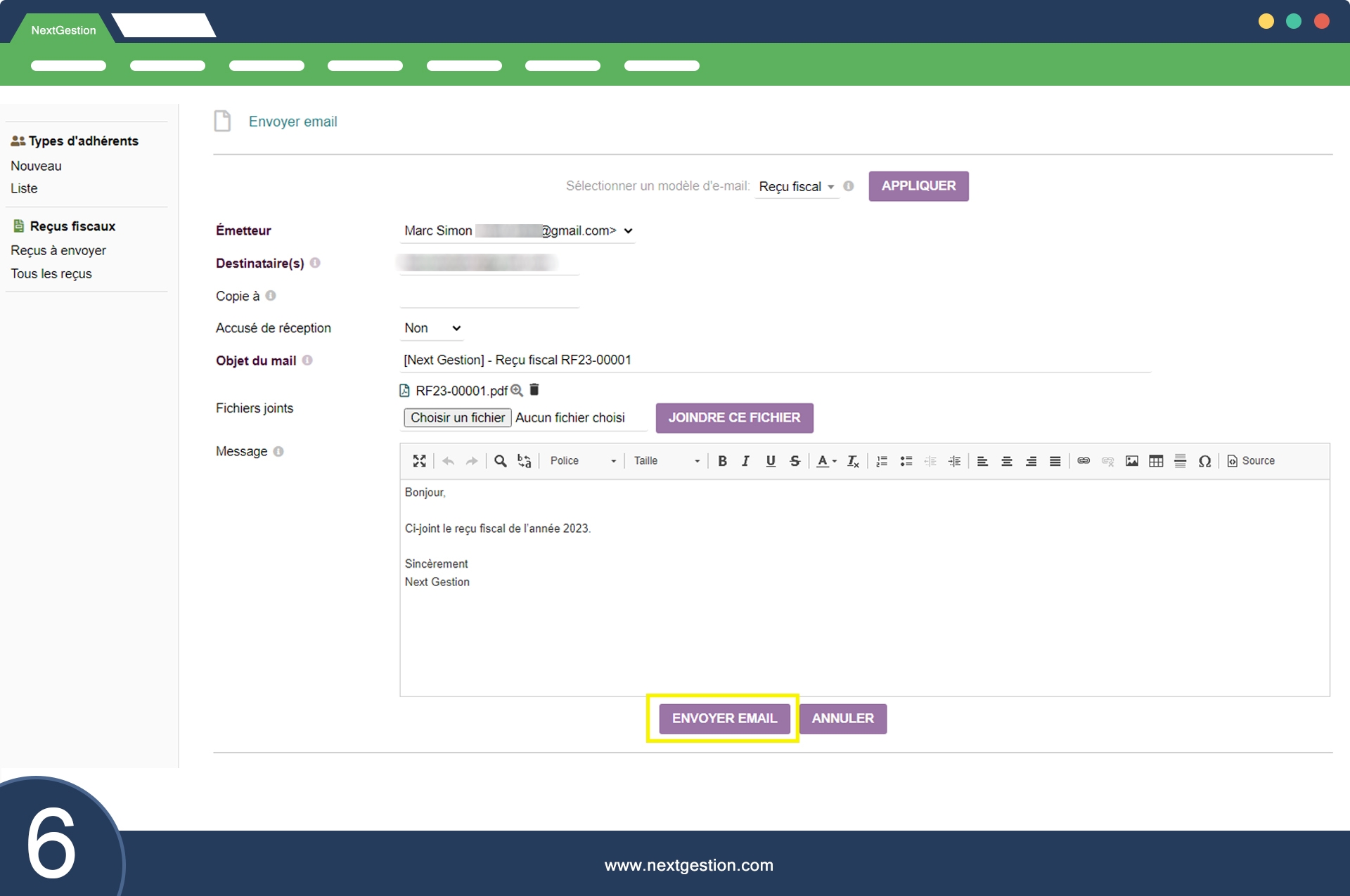 Enfin, le module "Reçu fiscal" permet également de suivre l'état de l'envoi par e-mail des reçus fiscaux aux adhérents. Cette fonctionnalité est particulièrement utile pour les organisations souhaitant gérer leur communication avec les adhérents de manière automatisée et efficace.
