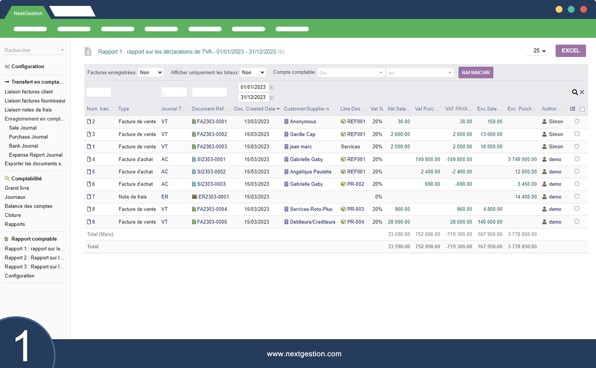 1- Le Rapport 1 est un rapport sur les déclarations de TVA, qui couvre une période spécifique du 1er janvier 2023 au 31 décembre 2023. Ce rapport permet de vérifier la conformité de l'entreprise avec les réglementations fiscales et peut aider à éviter des amendes ou des pénalités.