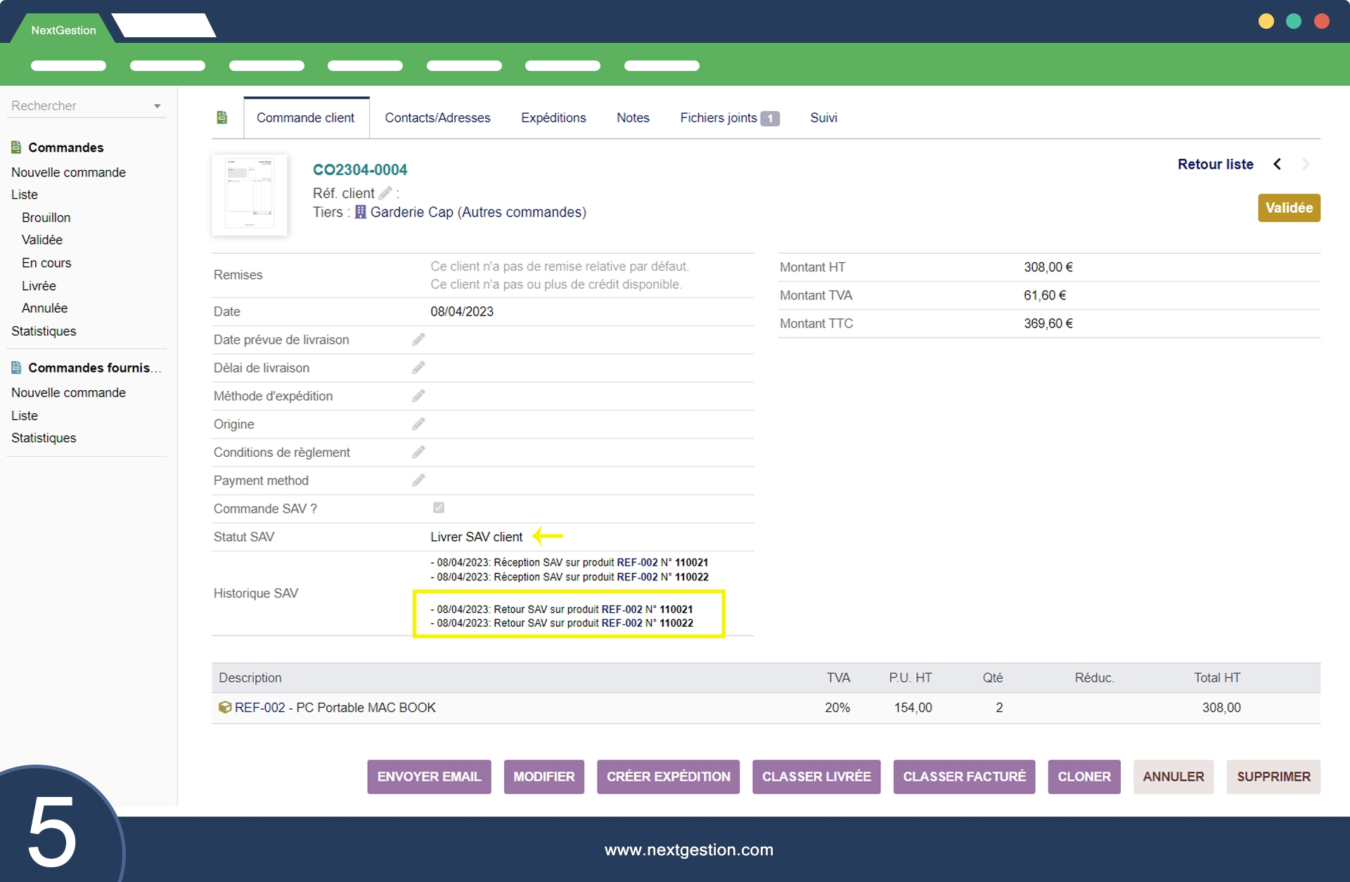 Le module "SAV Commandes" permet de faciliter la gestion des commandes de type SAV en offrant les fonctionnalités suivantes :