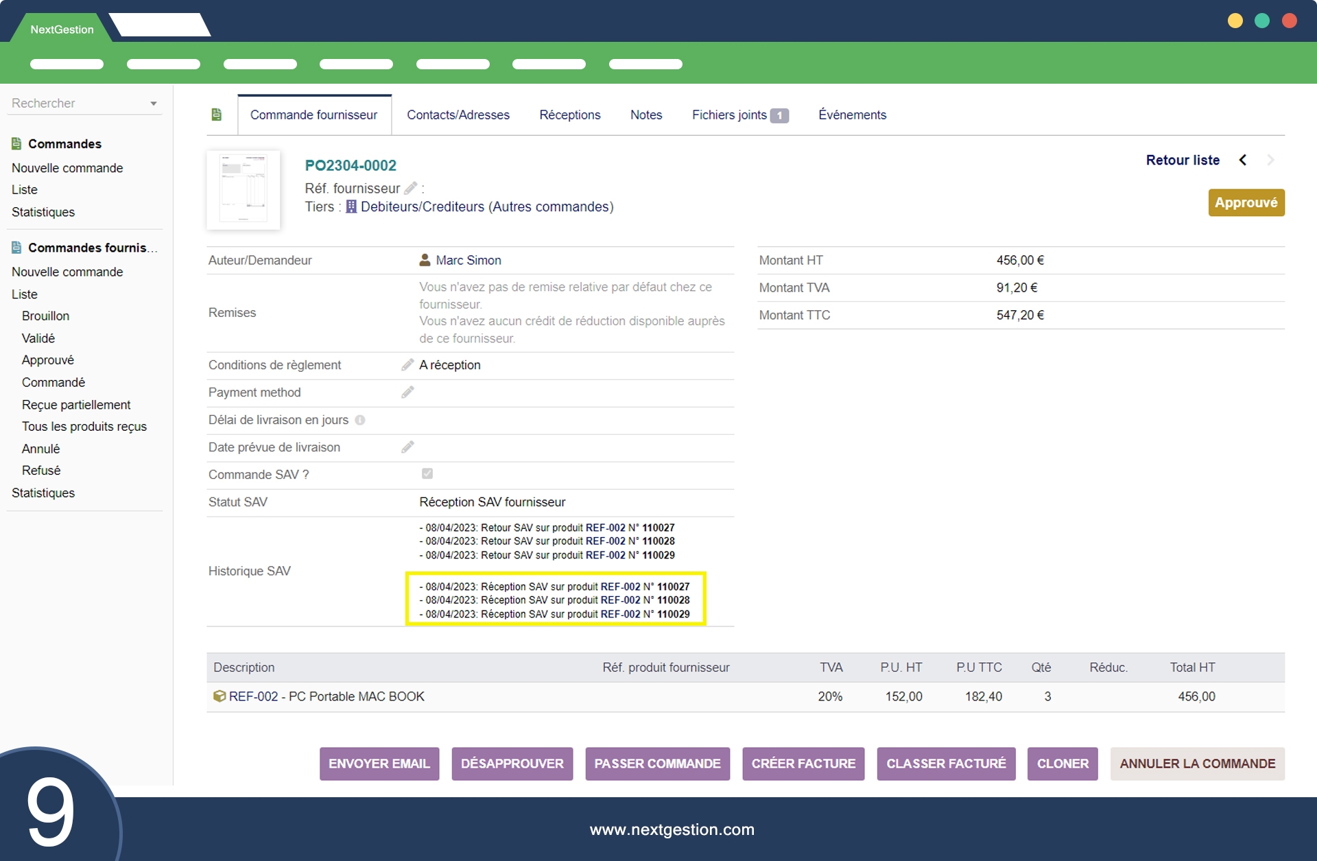 Suivi de l'historique des commandes SAV clients ou fournisseurs,