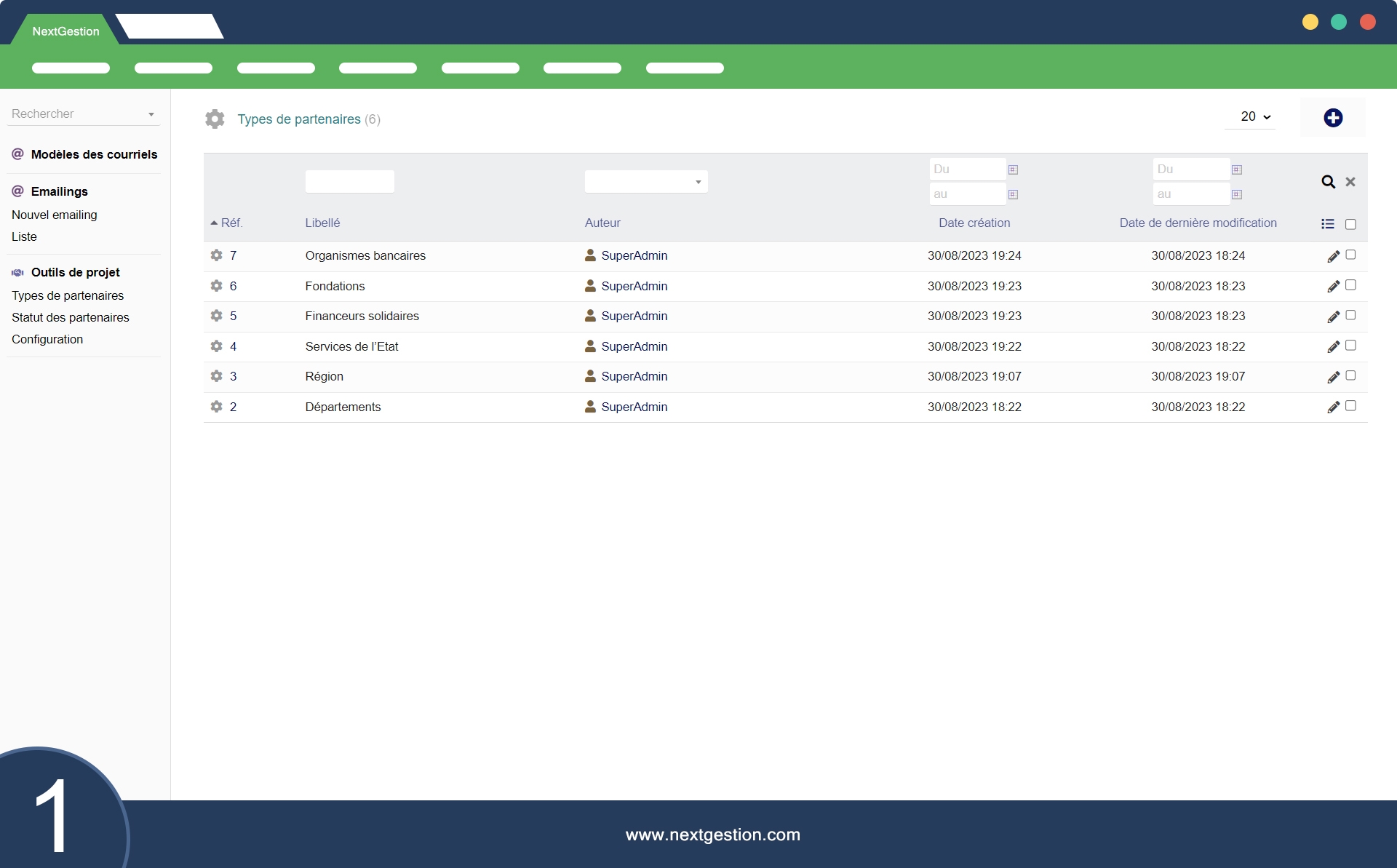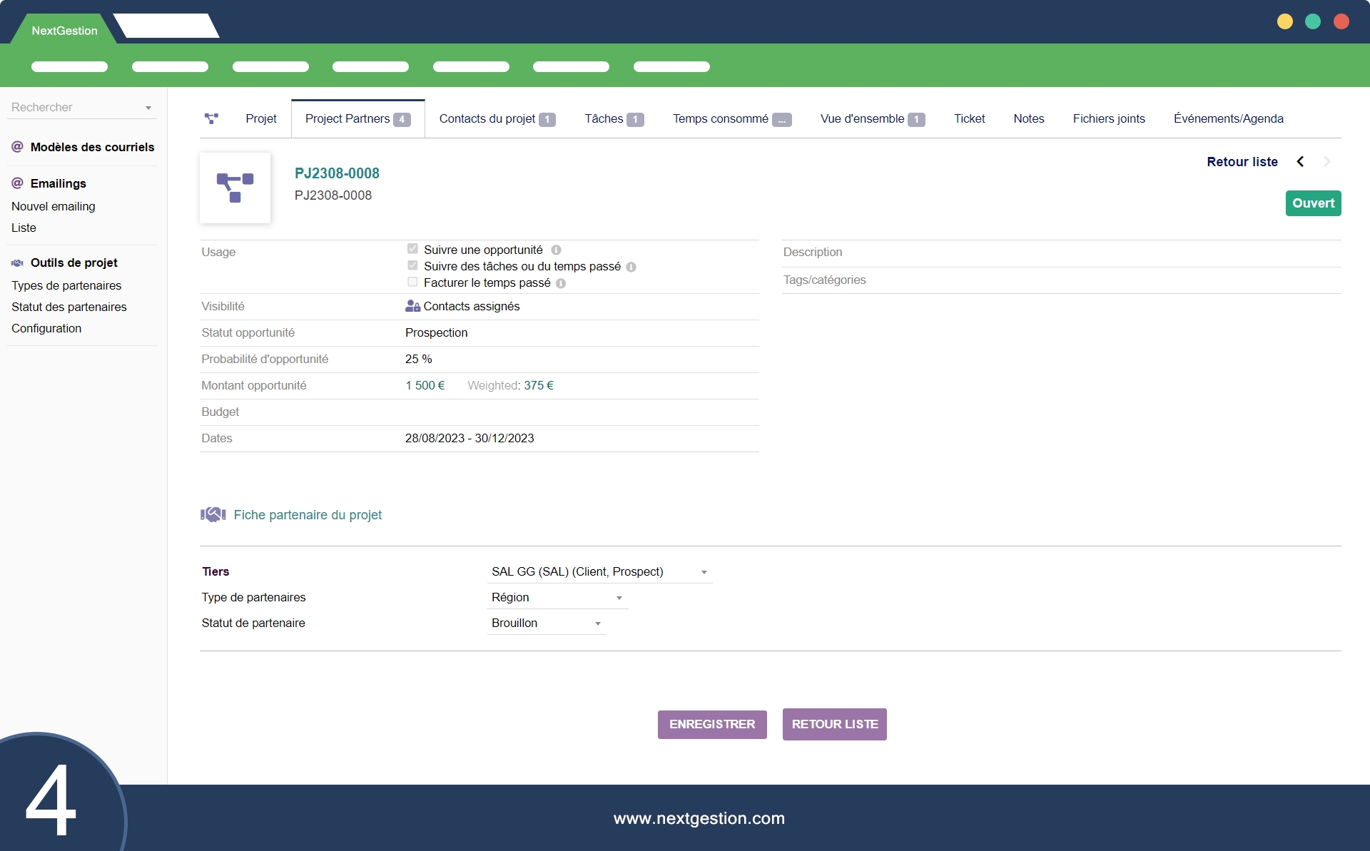Fonctionnalités : Nouveau, Modifier, Supprimer (Archivé) pour les partenaires de projet.