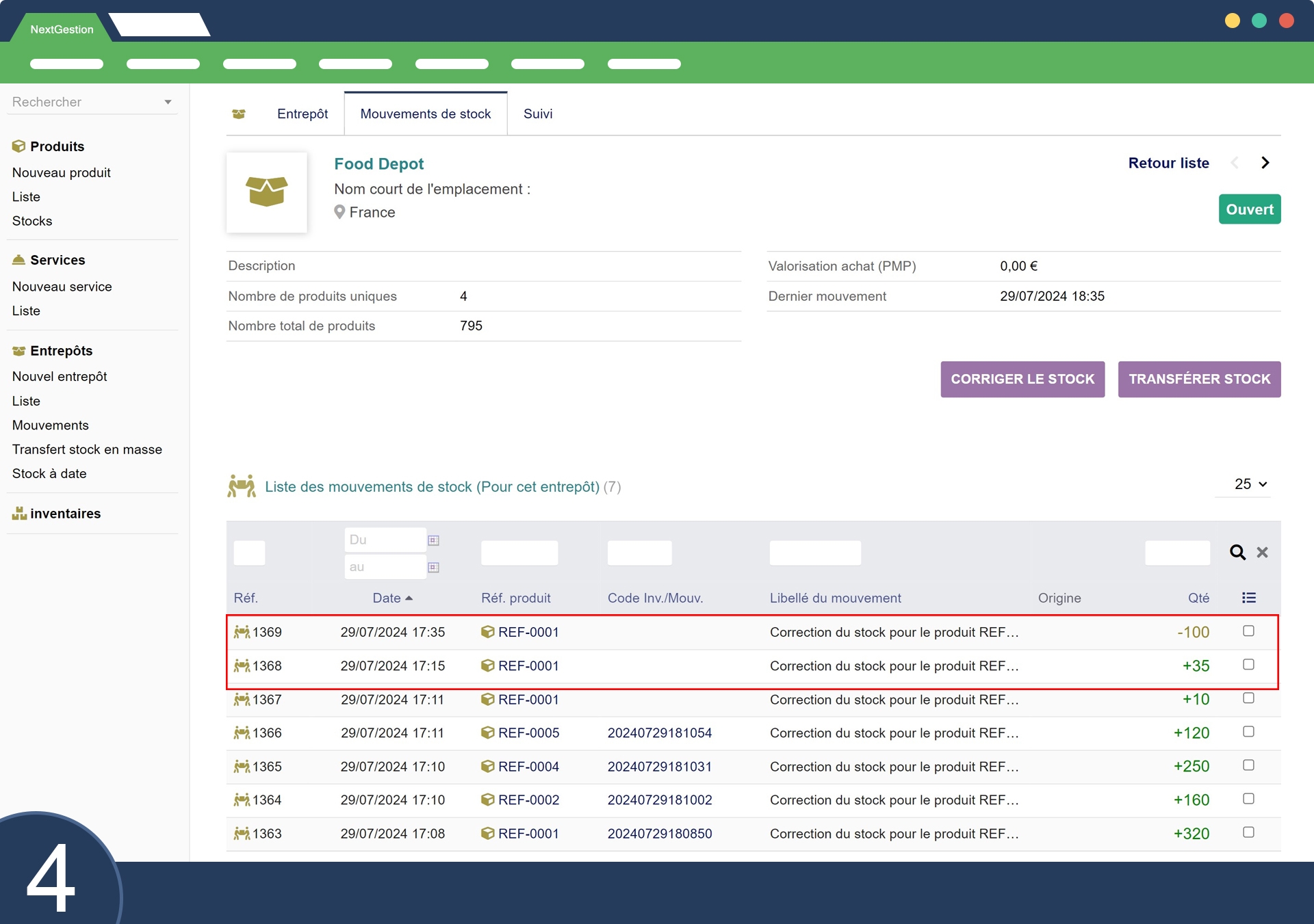 Exemple: L'image montre des corrections de stock pour le produit "REF-0001 - PC Portable HP" avec des ajustements de +35 et -100 unités, enregistrés à des heures précises.