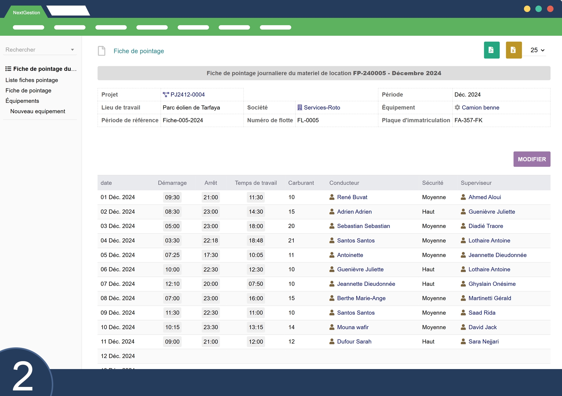 - Consulter des listes détaillées affichant les dates, heures de travail, conducteurs et superviseurs.