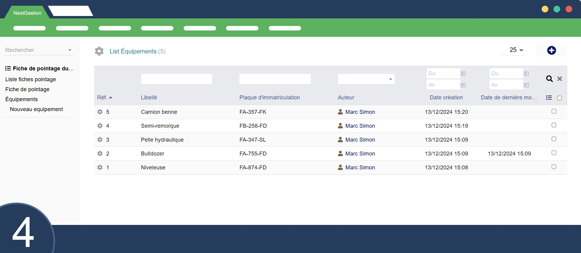 - Ajouter de nouveaux équipements avec leurs caractéristiques (libellé, plaque d’immatriculation).