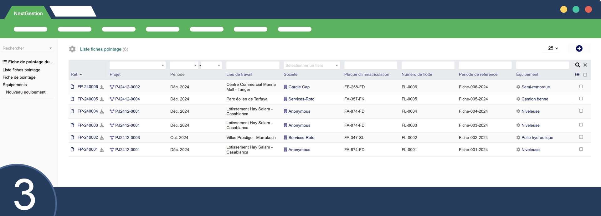 - Filtrer et rechercher les fiches par projet, période, société, ou type d’équipement.